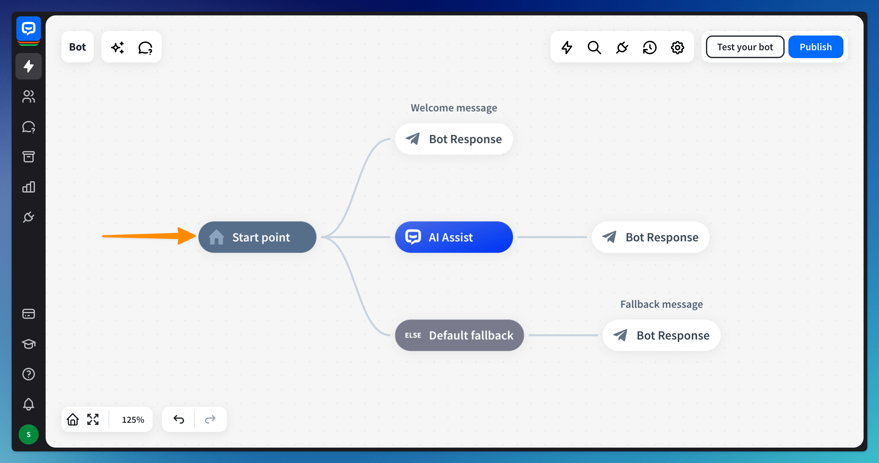 The Start point block shows where your bot flow begins. It’s a trigger point that can’t be edited. You can add any action or interaction to this block.