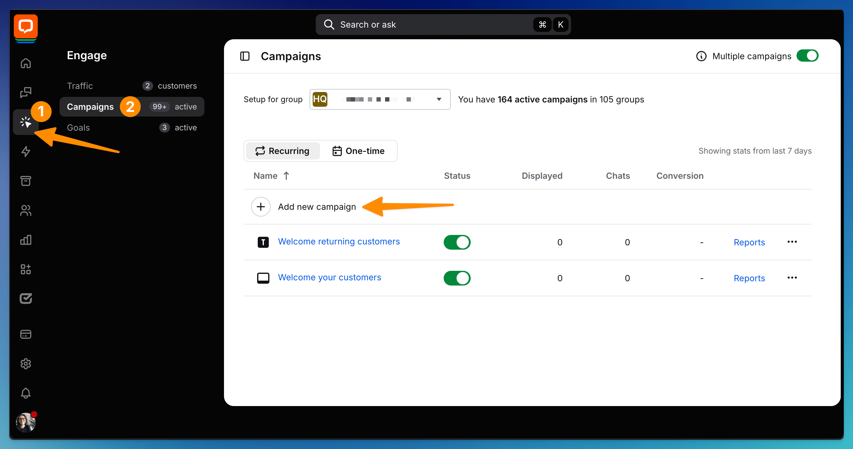 The Campaigns configuration panel is located in the Engage section of the LiveChat app. In that section, you can see how many campaigns are active, add new ones and configure existing ones, turn them on and off, and enable displaying multiple campaigns on your site.