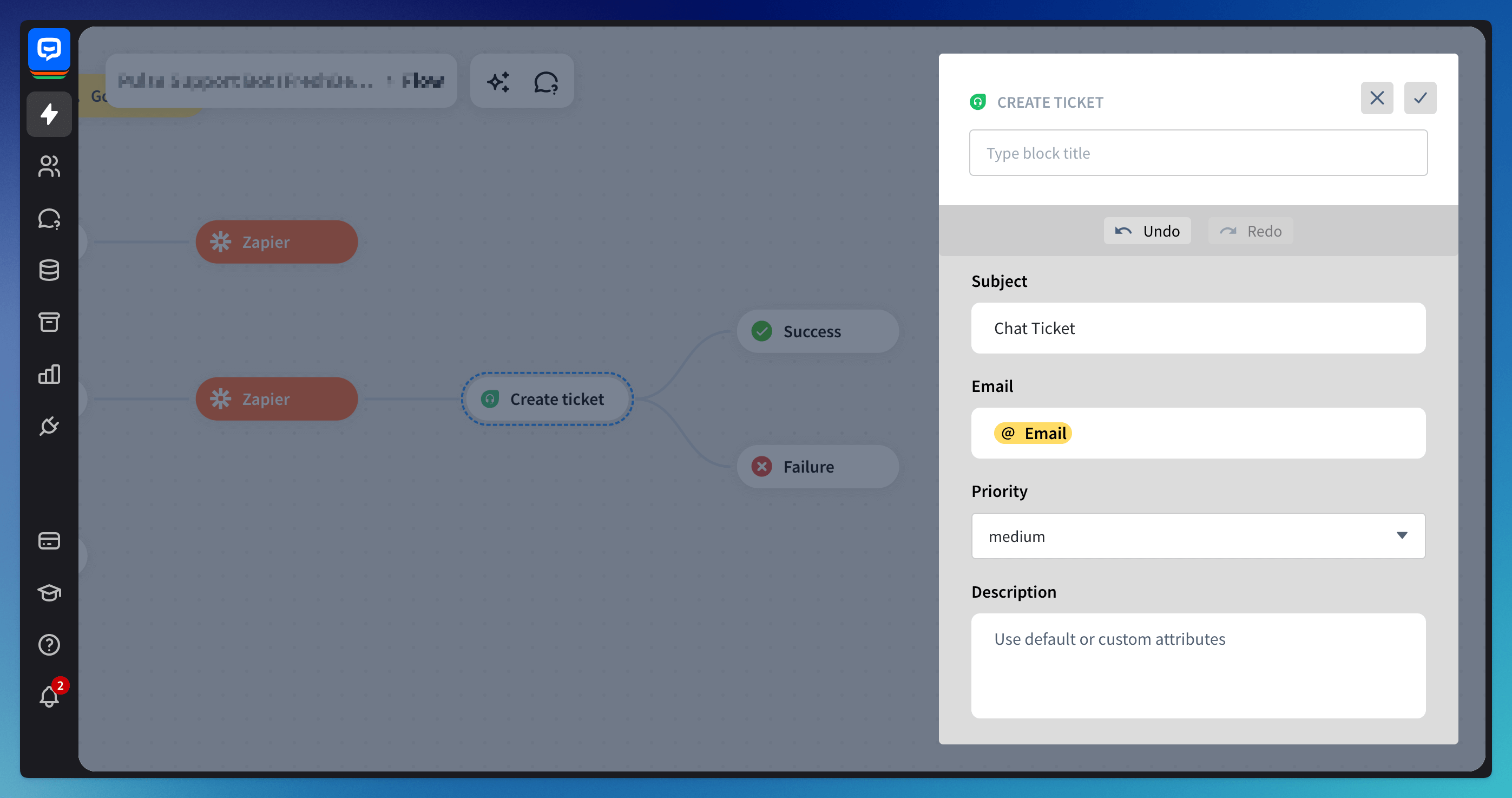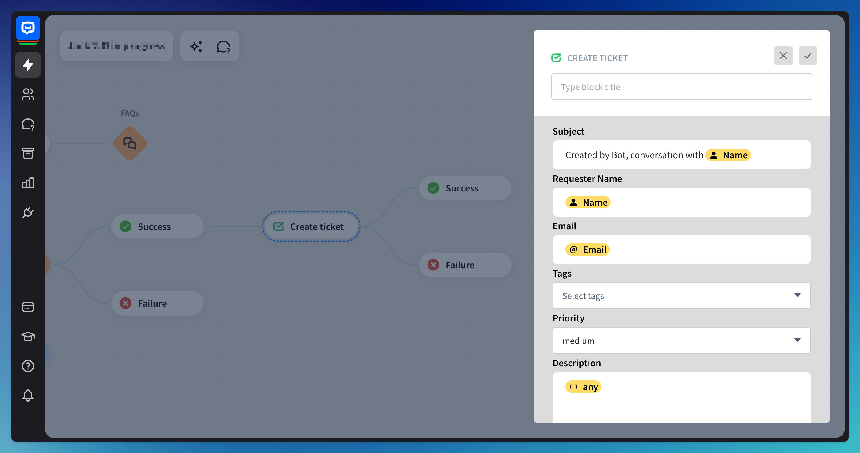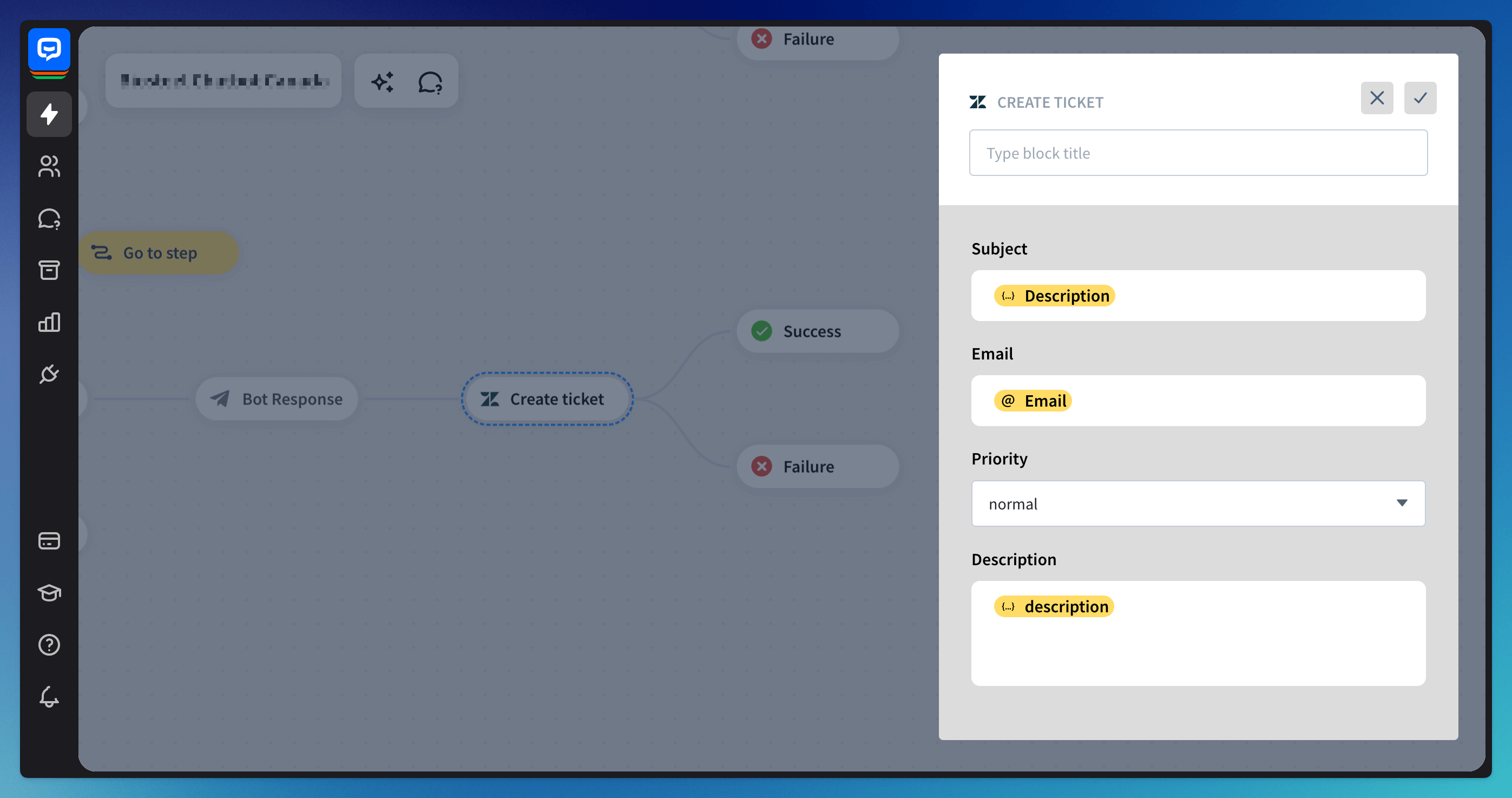 Using the Create Ticket action for HelpDesk, you can create a ticket with all the necessary details from customers during an ongoing chat. Collect the details with the Question action and send them to HelpDesk for your team to manage.