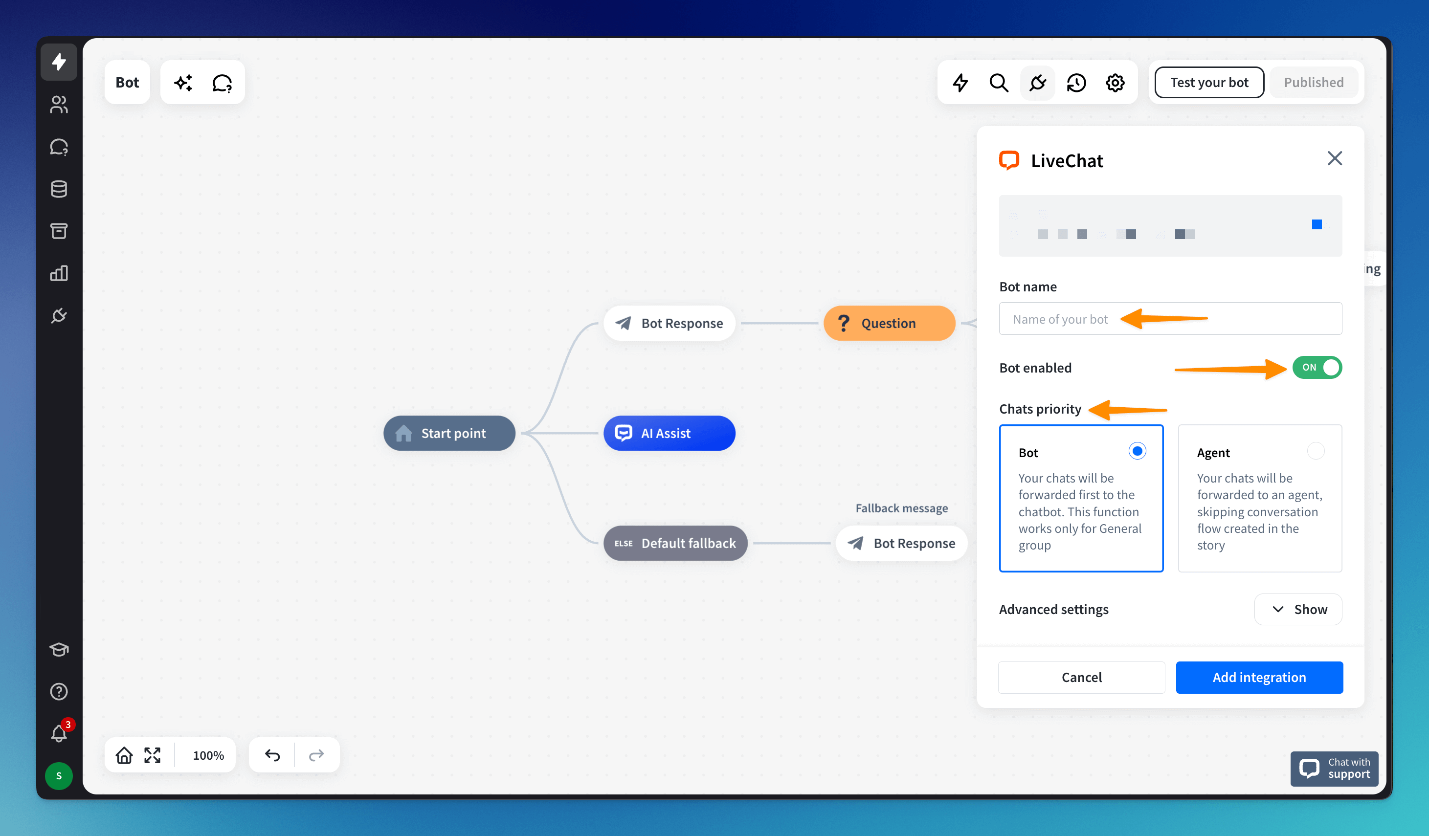provide the Bot name - this name will be visible in the LiveChat Chat Widget while the bot chats with users