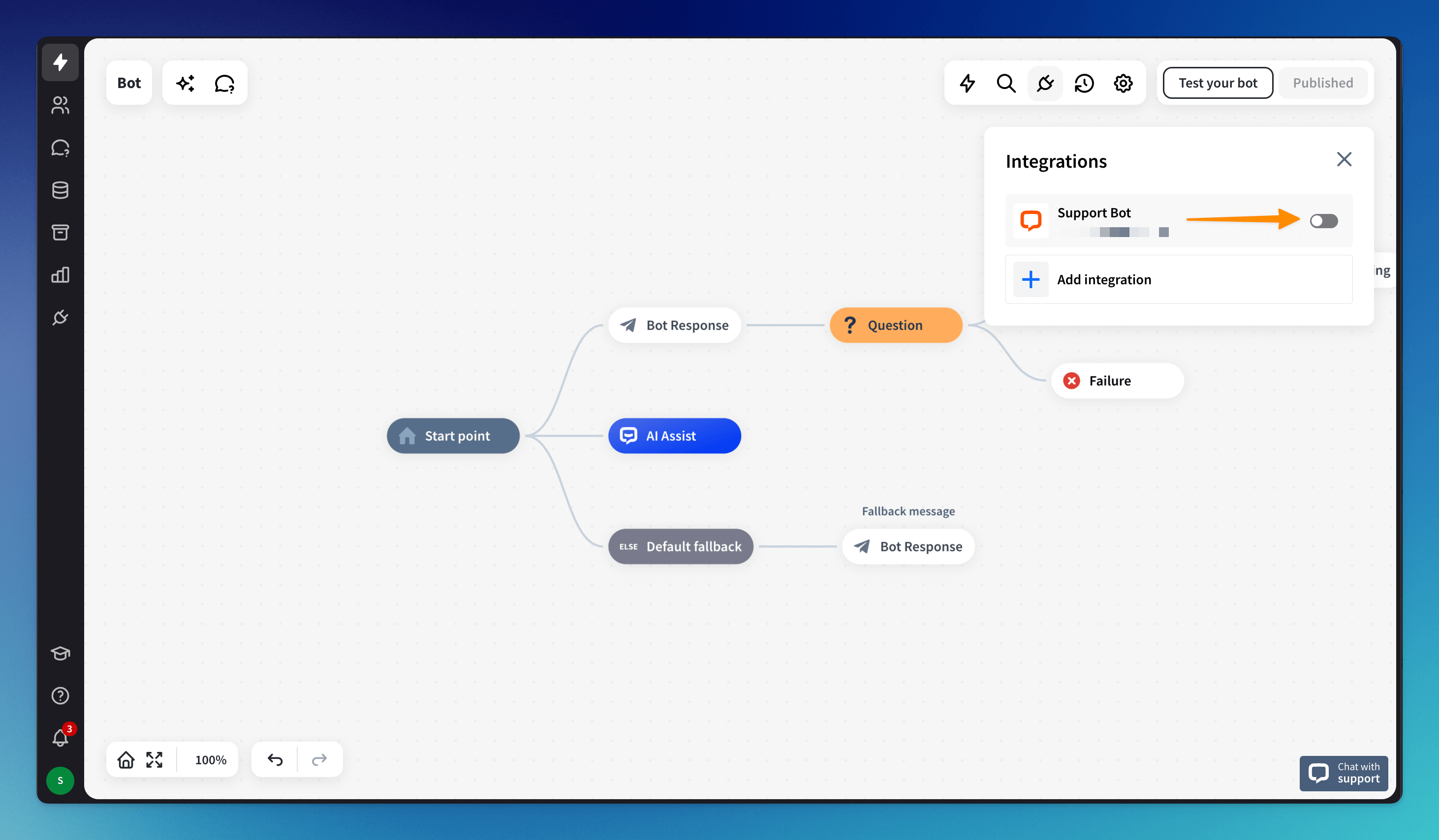 This integration process applies to bots created in the new bot builder view. The integration happens directly in the bot builder view. You can finish it in a few clicks.