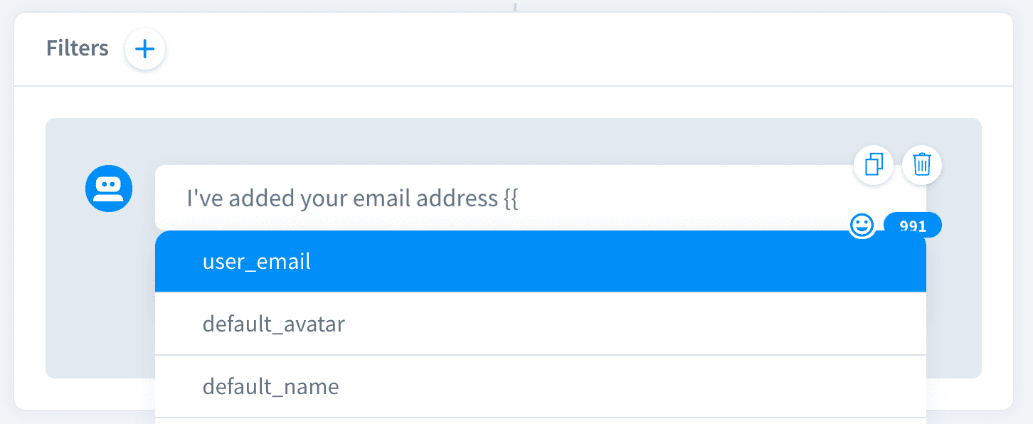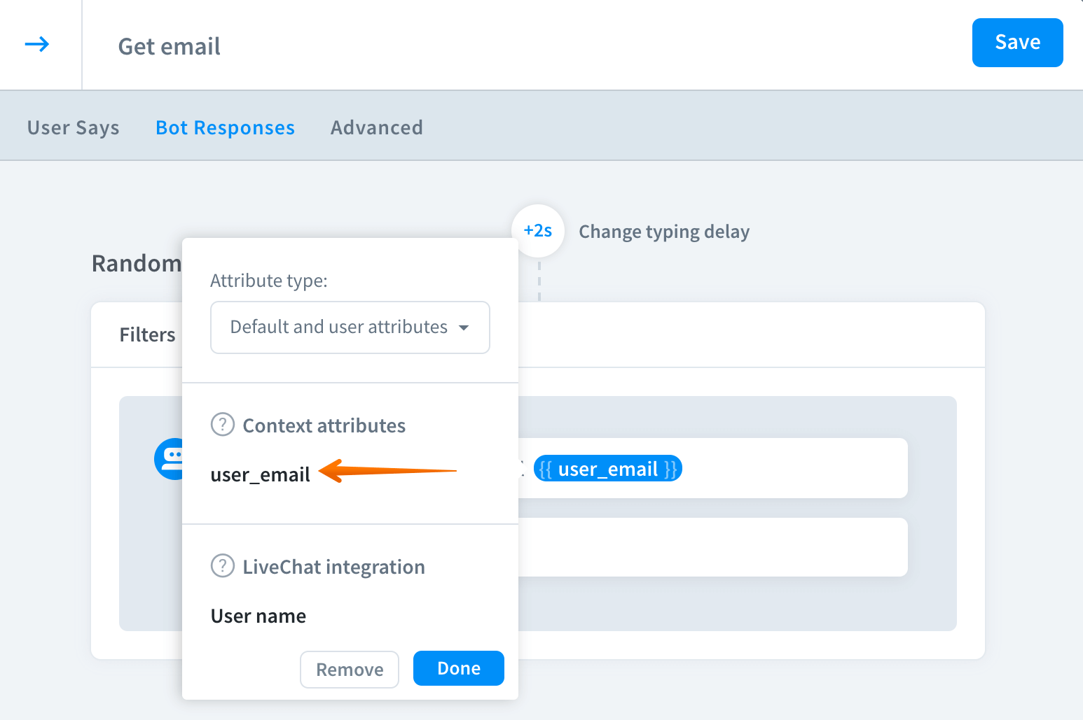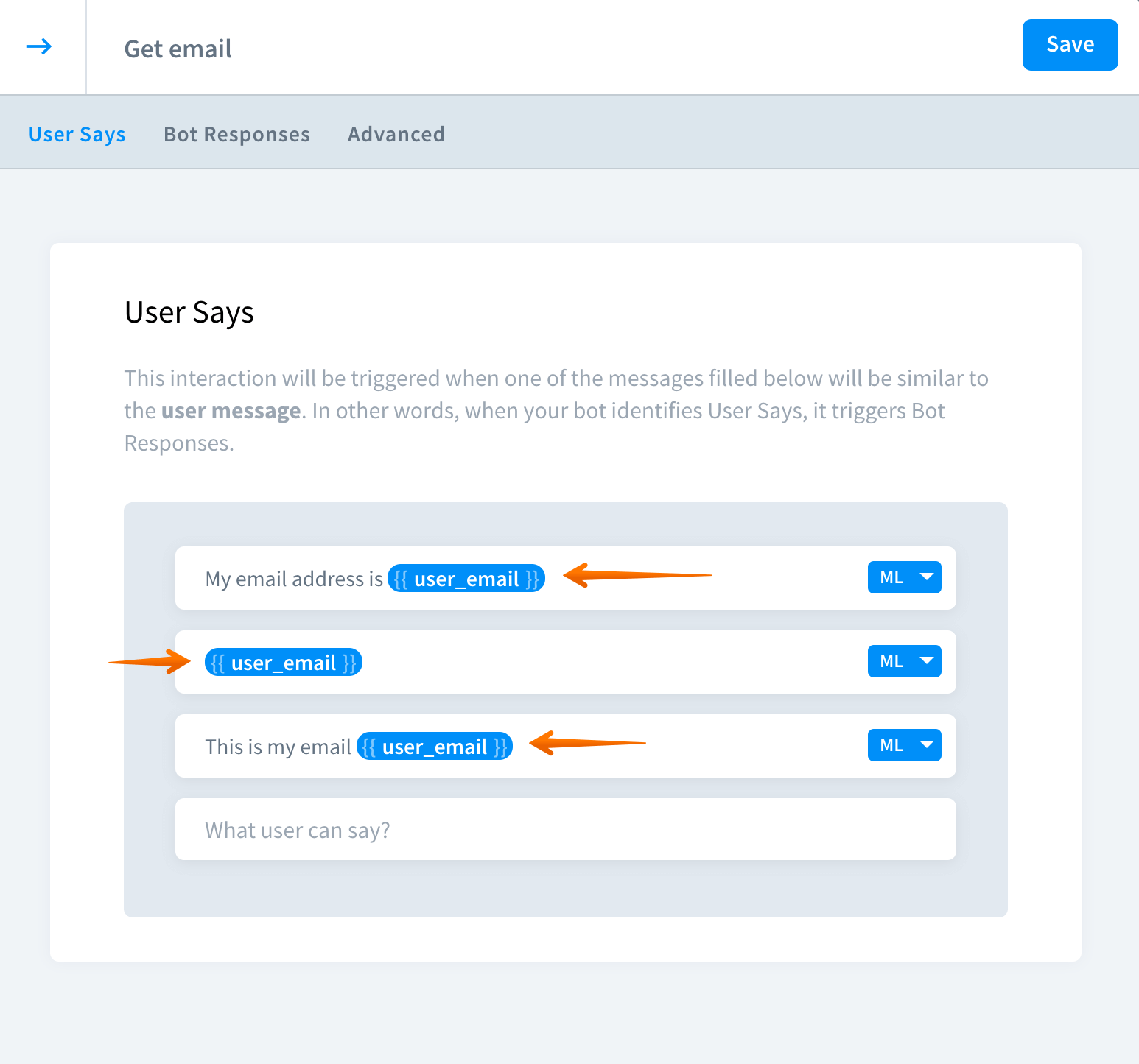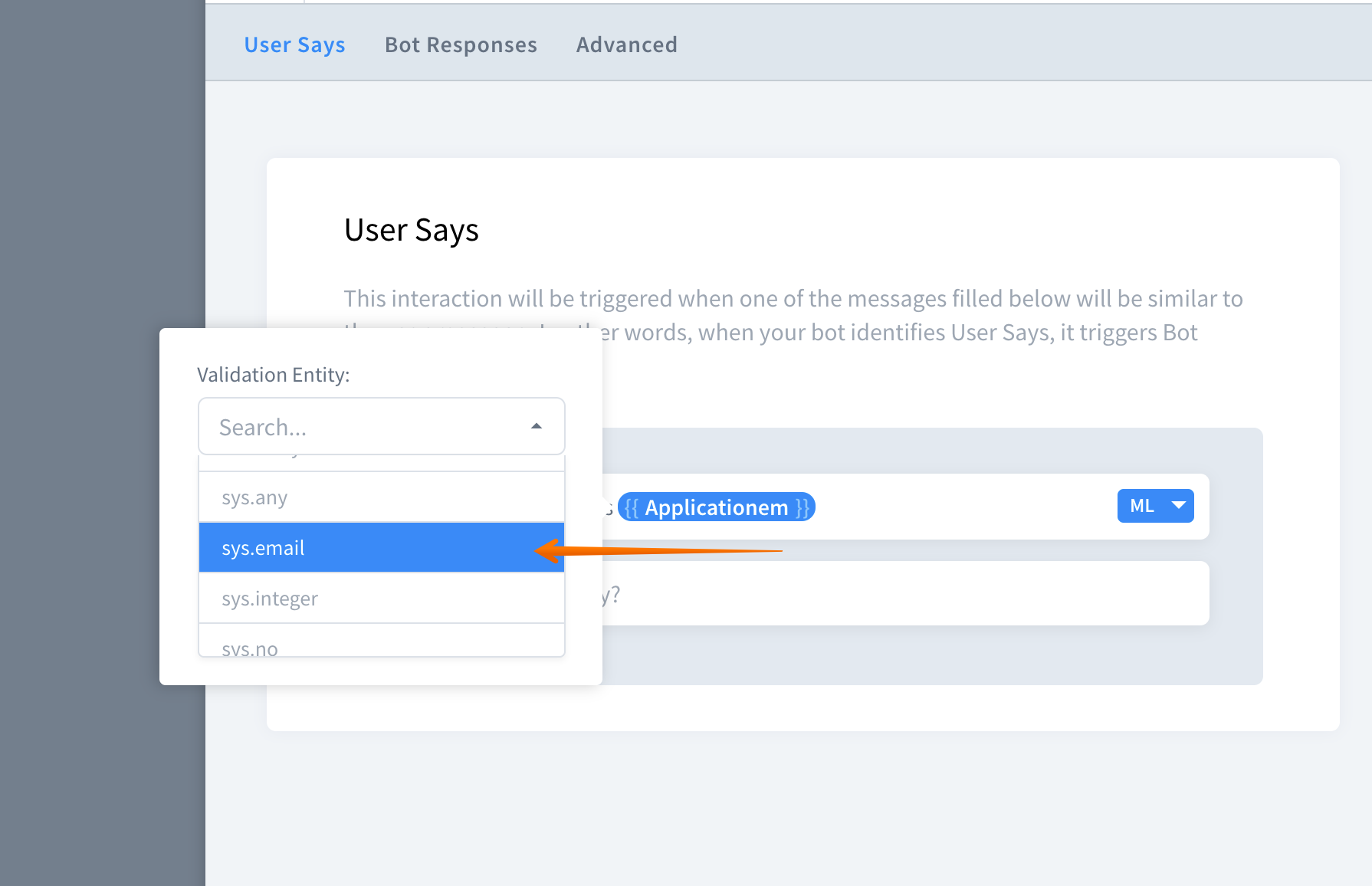 sys.emailentity to the user says section. To do so, type two curly brackets and select.sys.emailand name your attribute. FInd out more about this entity here.