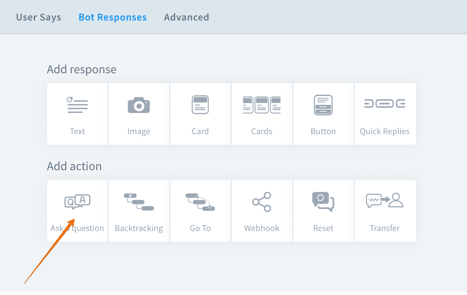 In the Interaction view, select Bot responses. Here you’ll find the Ask a Question action.