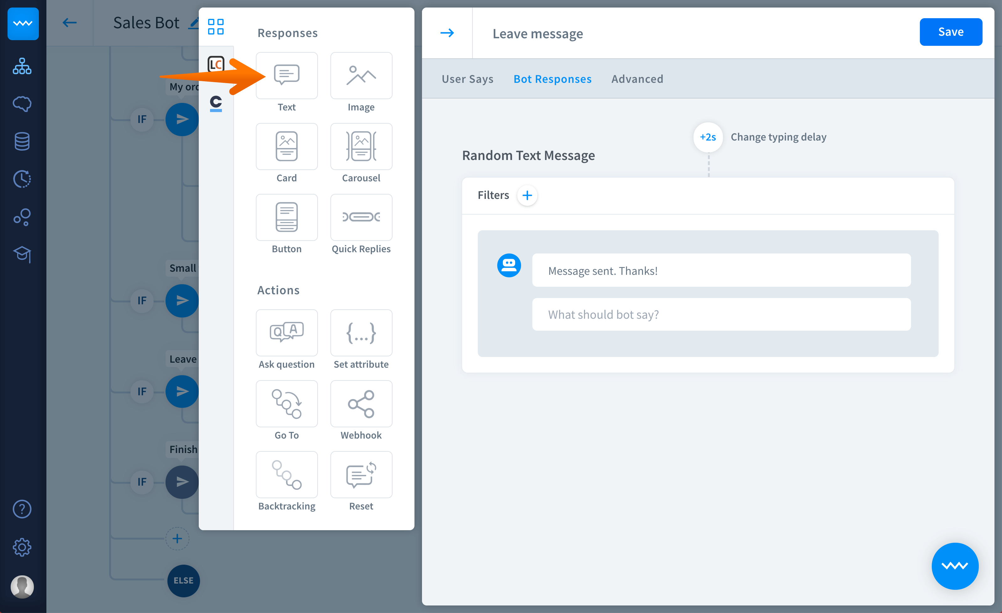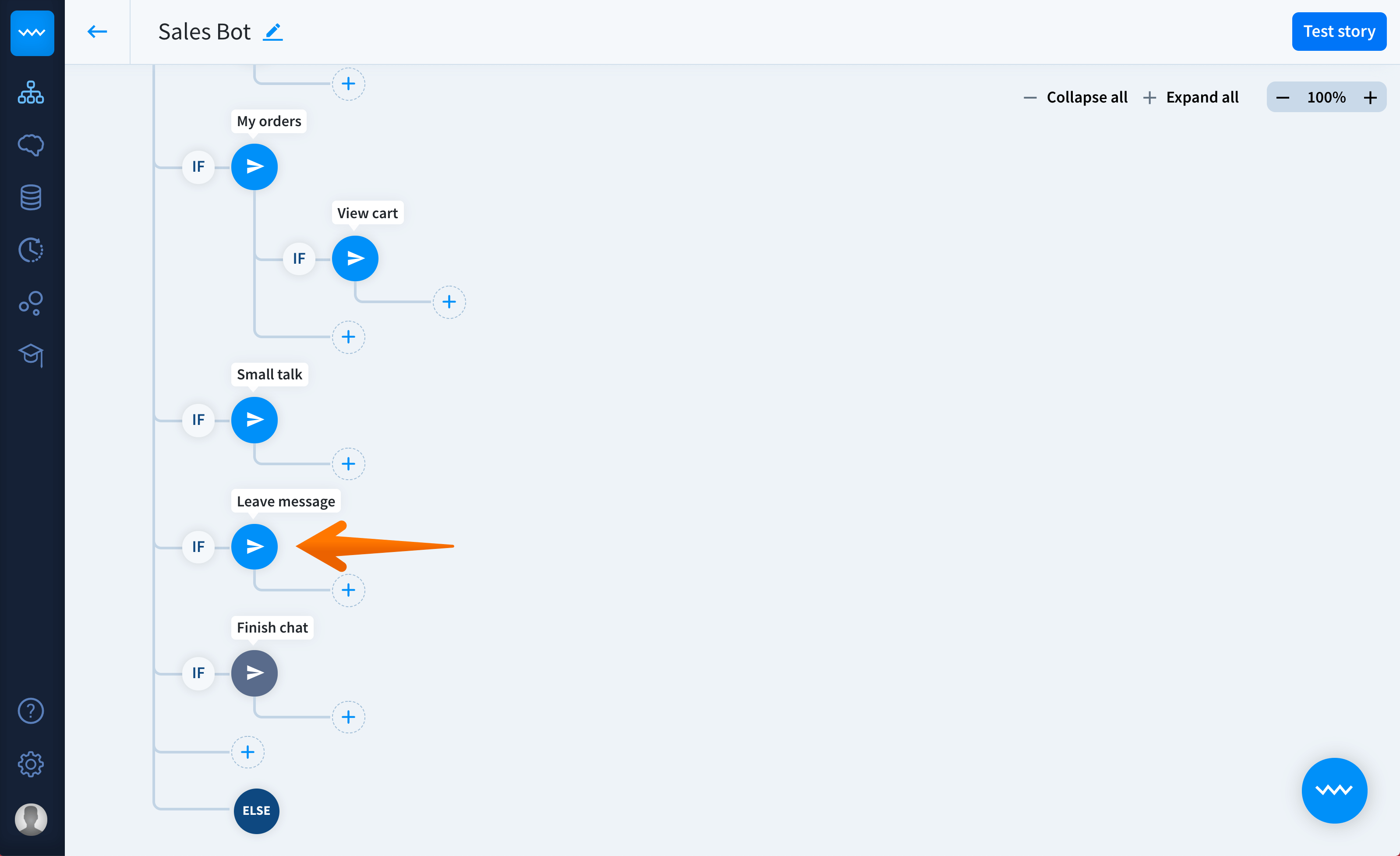 Go to your ChatBot dashboard and select a story that you want to modify. Add a new interaction and name it Leave message.