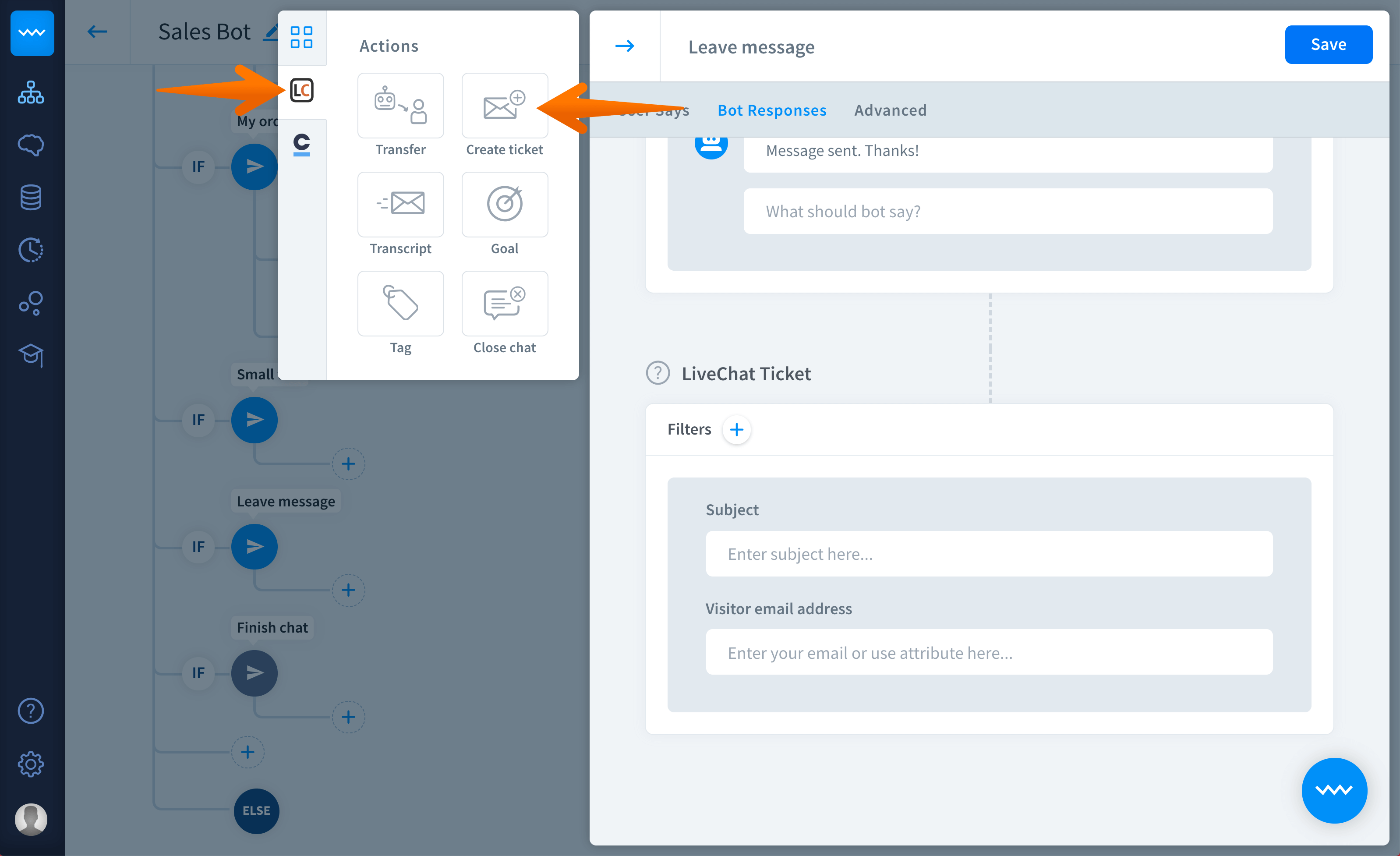 Next, go to the LiveChat section in bot responses and add the create ticket action.
