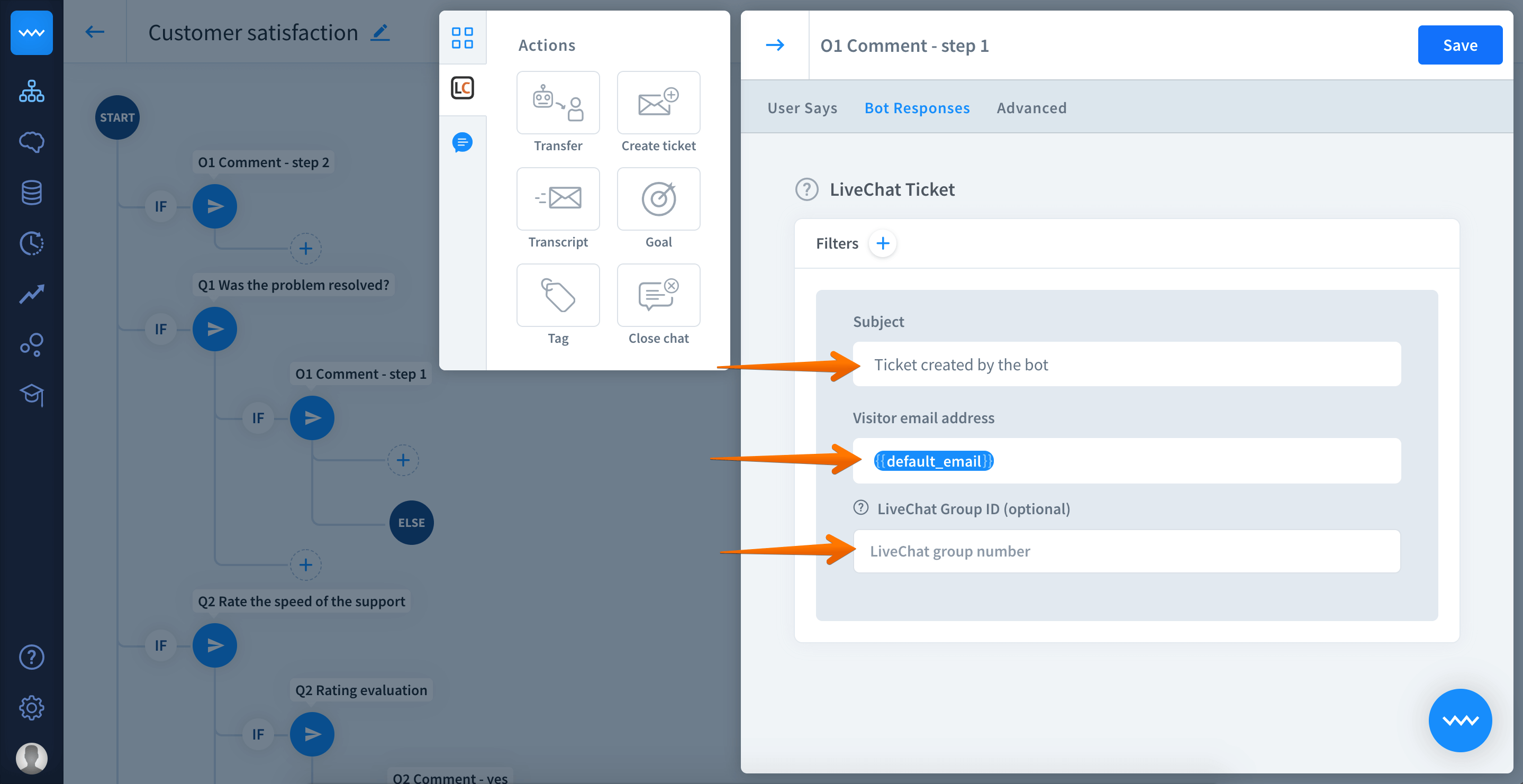 Before to add the ticket action to your story, make sure that you’ve collected your customers’ email address. You can ask for the email in the pre-chat survey set in LiveChat or using ask question action that will prompt the user to provide the email address.