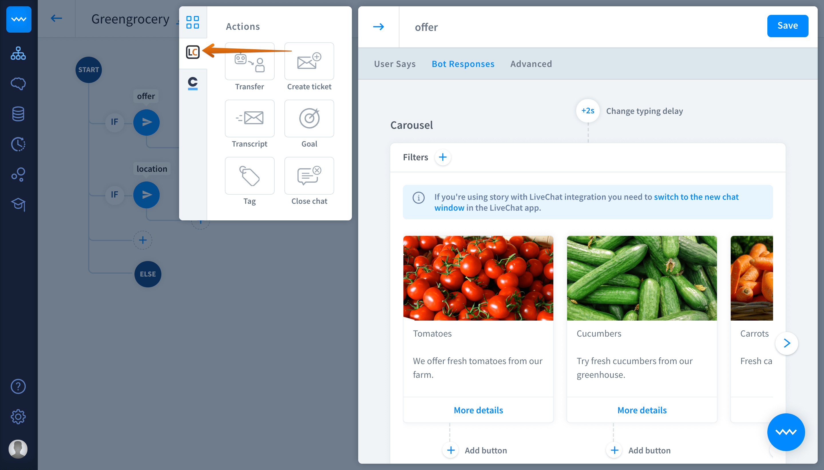 This bot response is designed only for LiveChat. Remember that you need an active LiveChat integration to use this bot action.