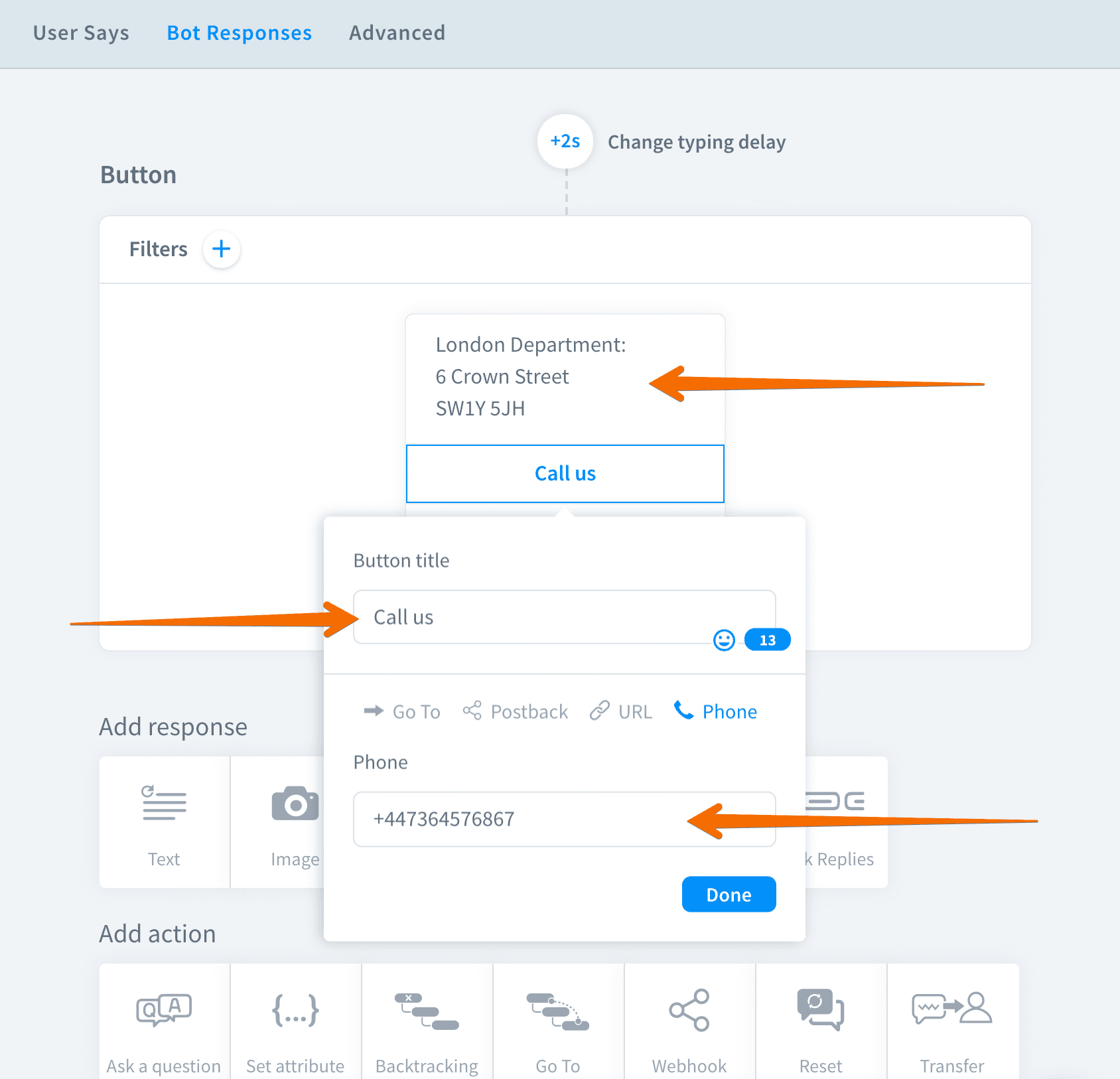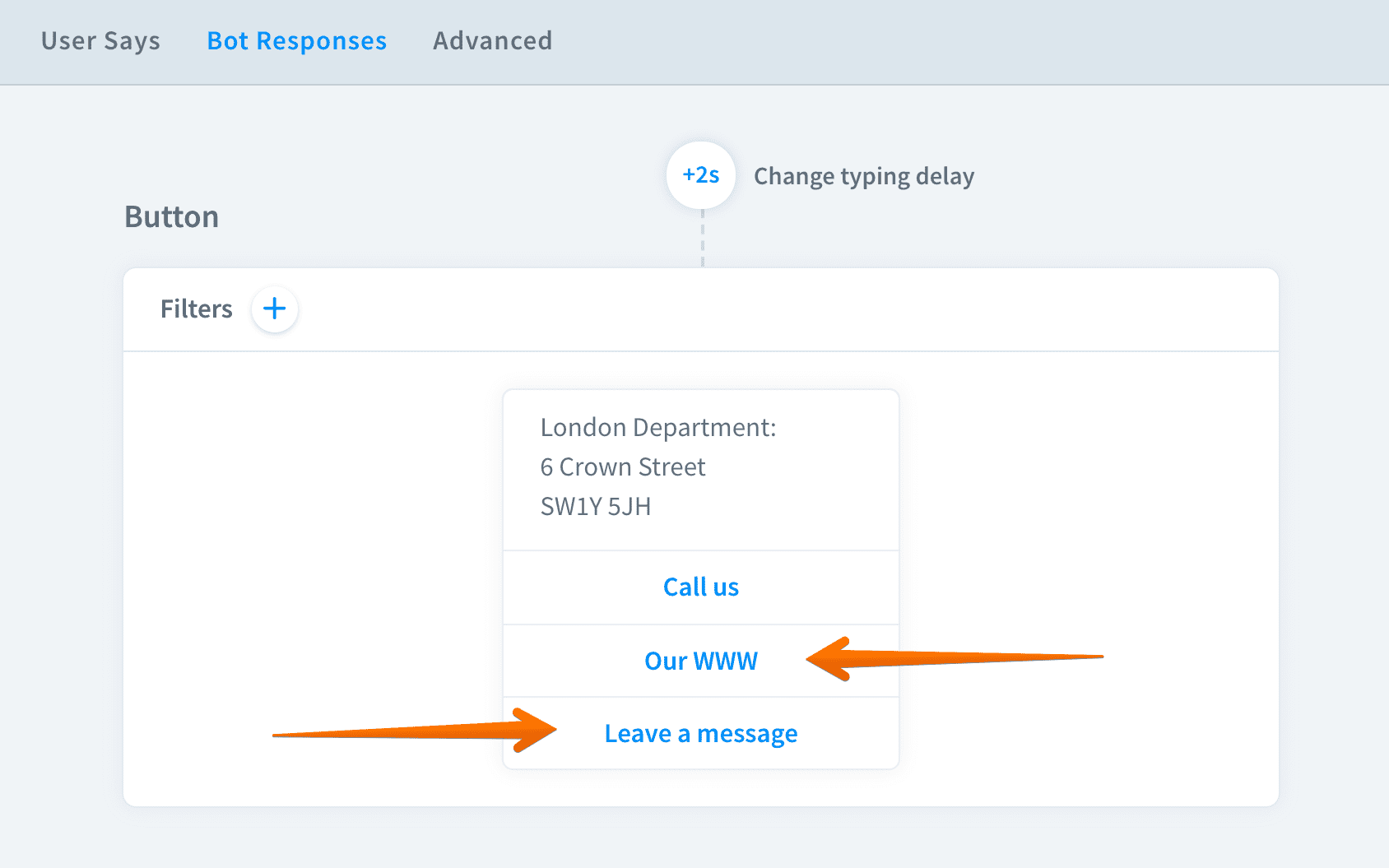 Button response type works with Facebook Messenger, Slack and Chat Widget integrations. To see the full compatibility table, go here.