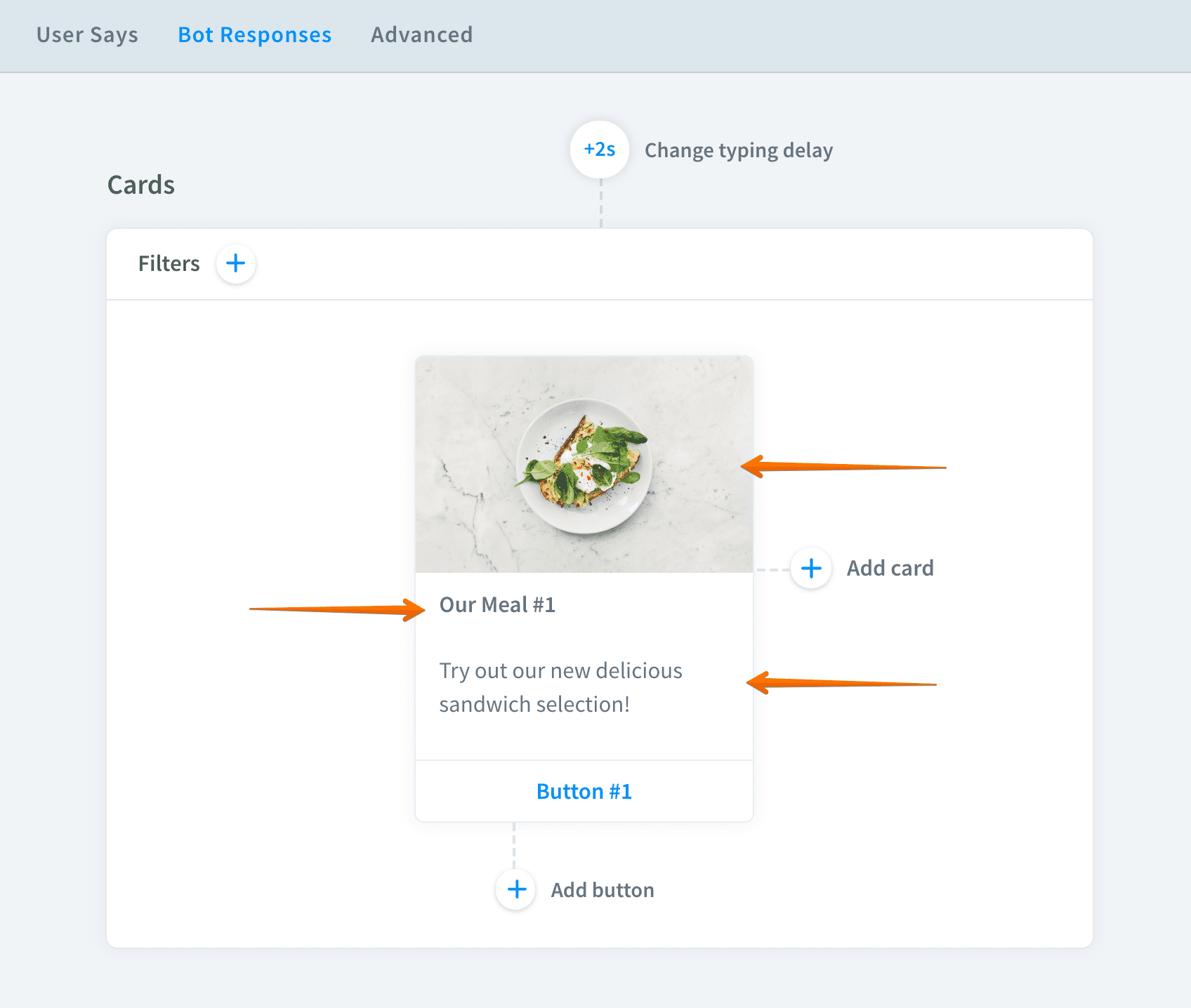 When you need more complex image solution for your replies, select carousel. With carousel you can add more detailed information to your images such as title and description. Additionally, you can add multiple buttons which direct the user to the right placer or trigger an action.