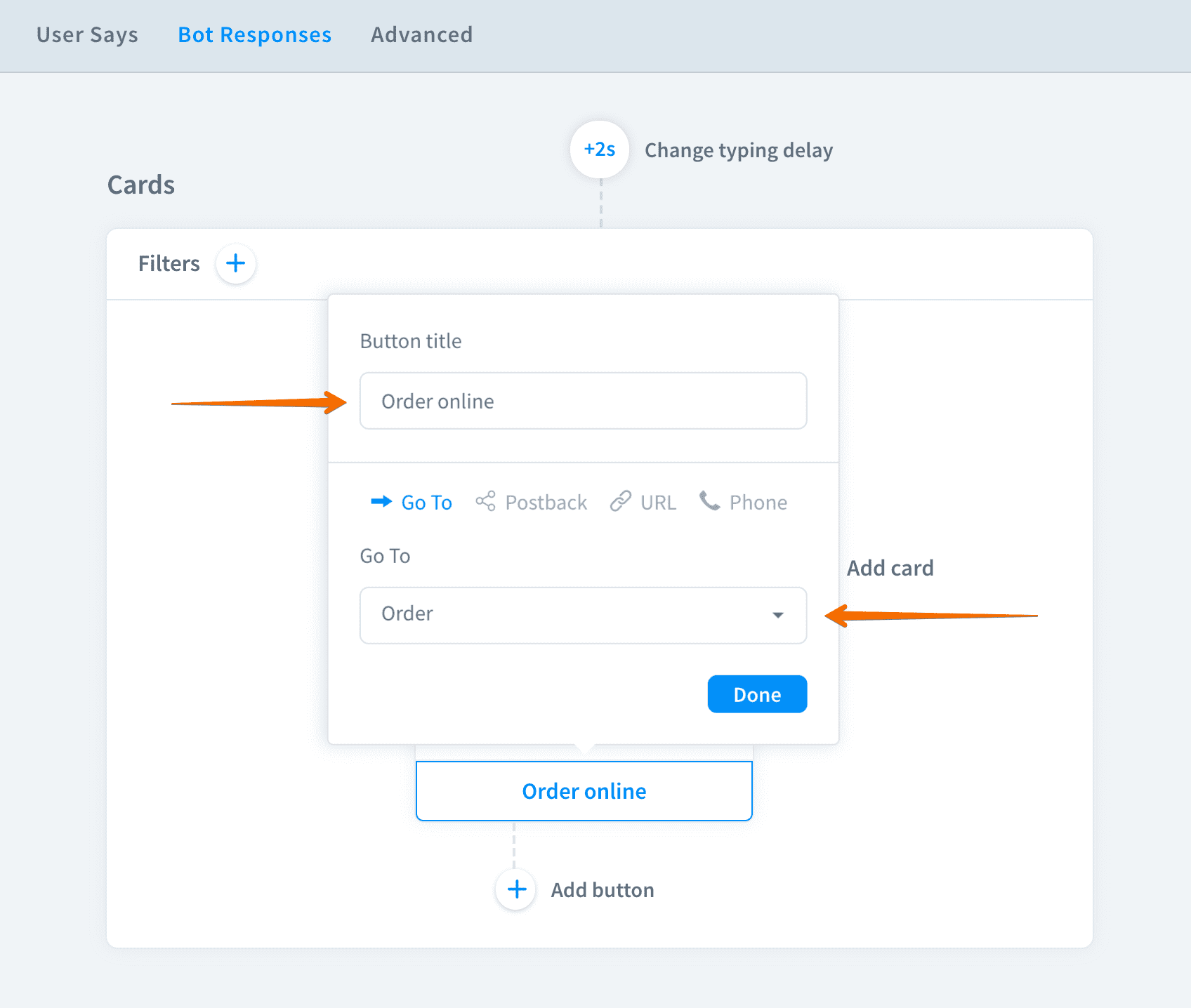 Additionally, you can add maximum five buttons to each card. Create a button, give it a name and assign an action. Choose from four button types.