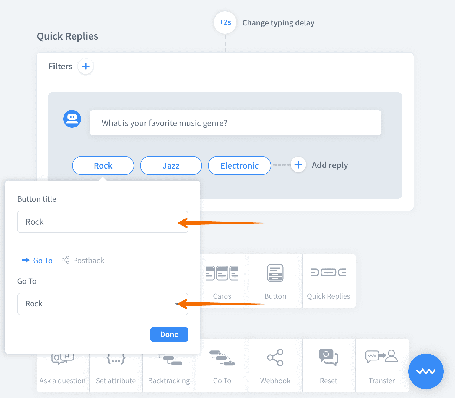 Quick replies work with Messenger, Chat Widget and Slack integrations. To see the full compatibility table, go here.