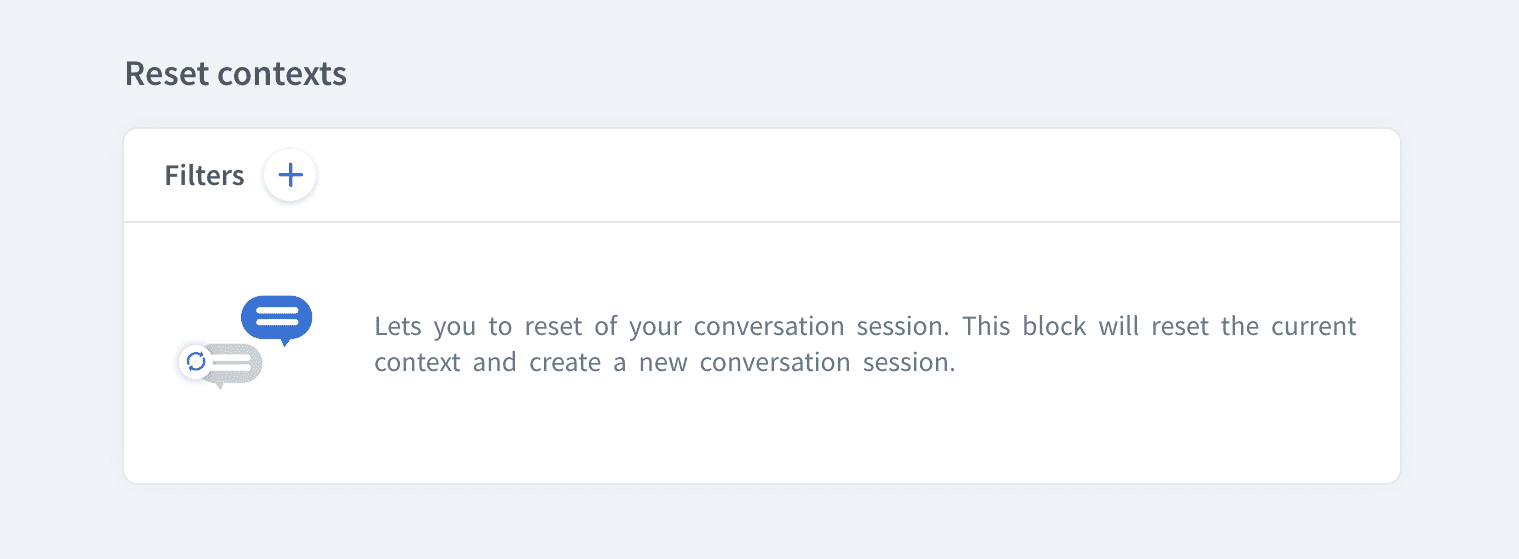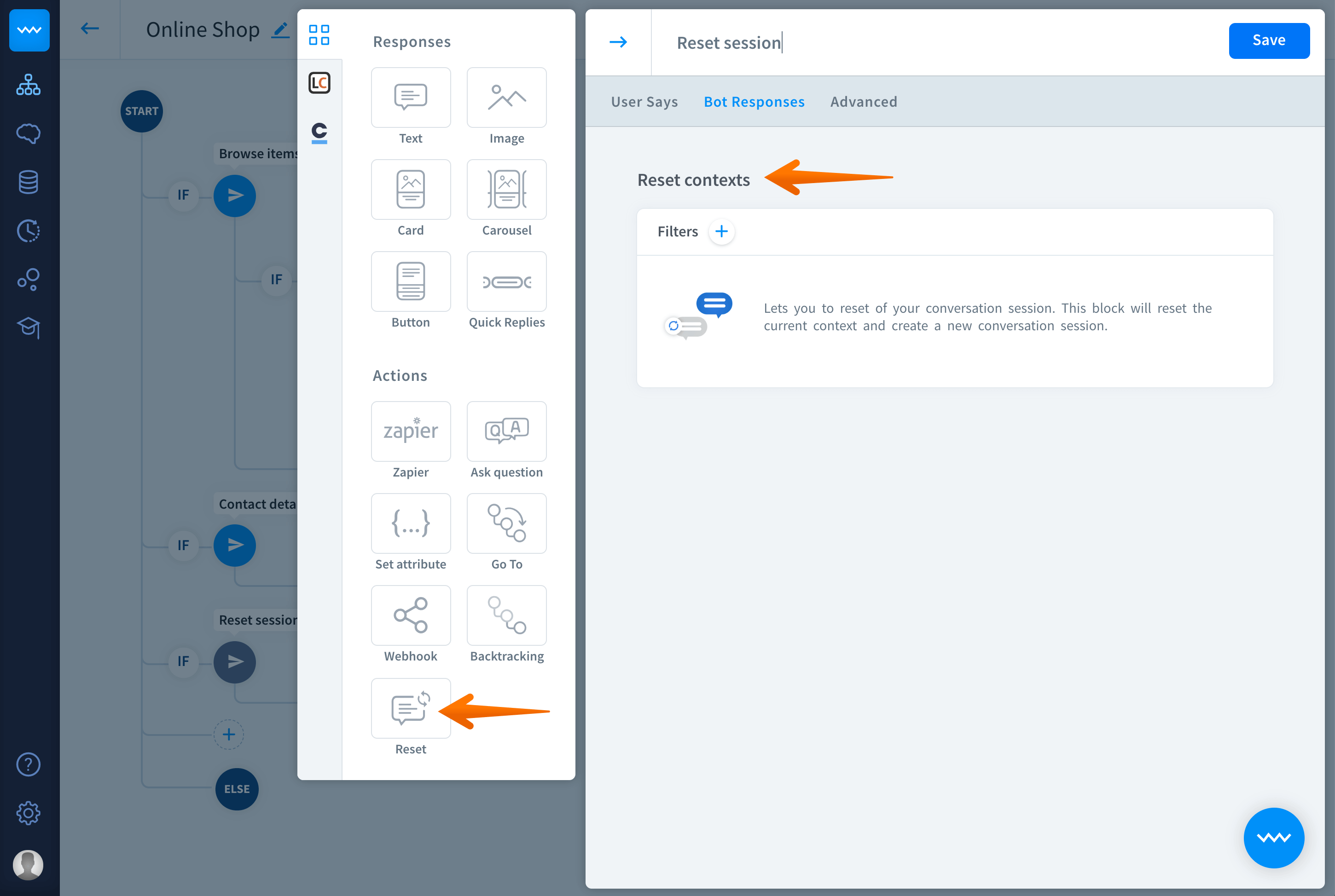 Use the reset action to clear contexts and attributes in ongoing chats.