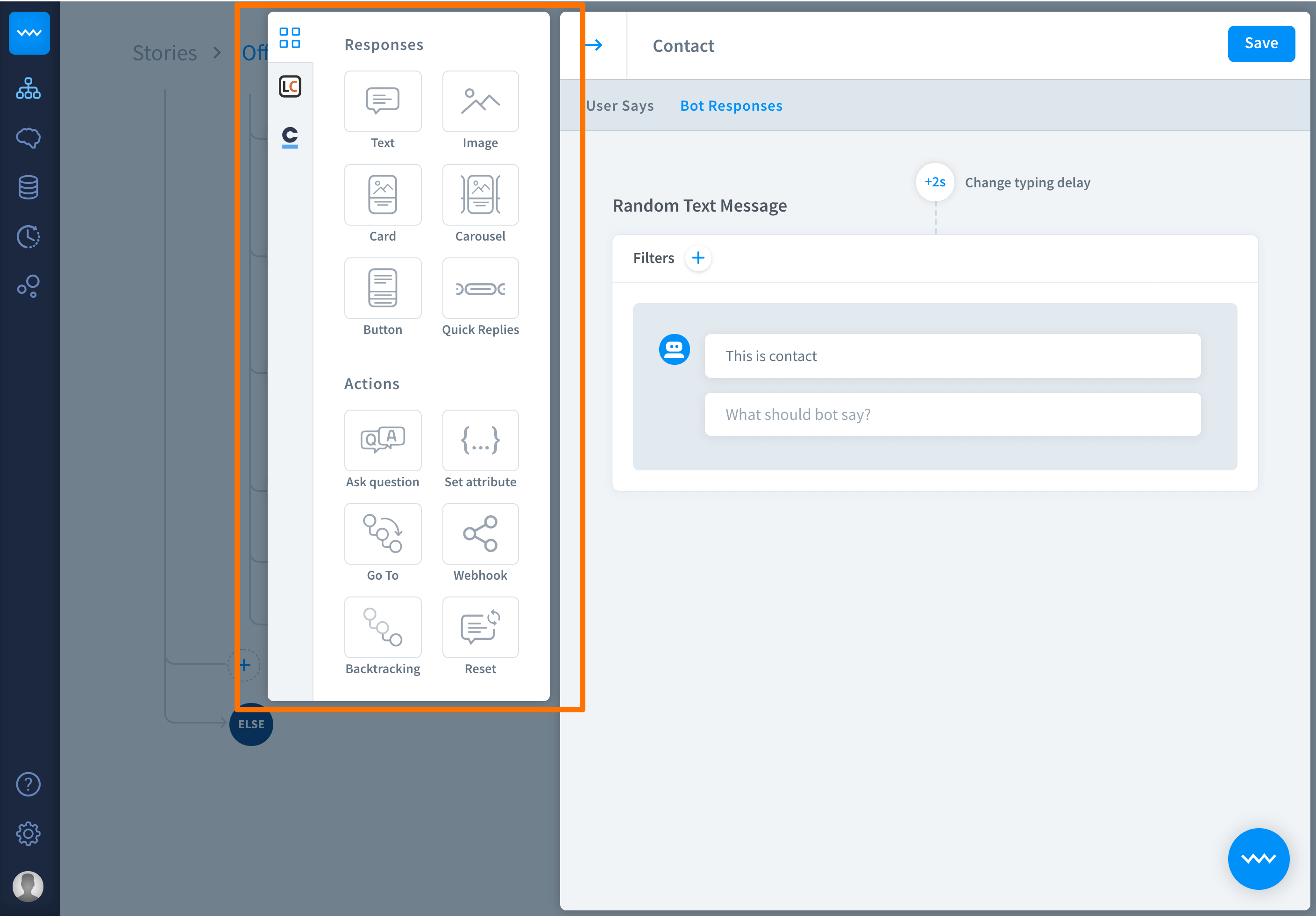 ChatBot gives you a lot of control over the conversation flow. You can choose from many available responses and actions to give your bot knowledge and personality and to navigate through the scenario.