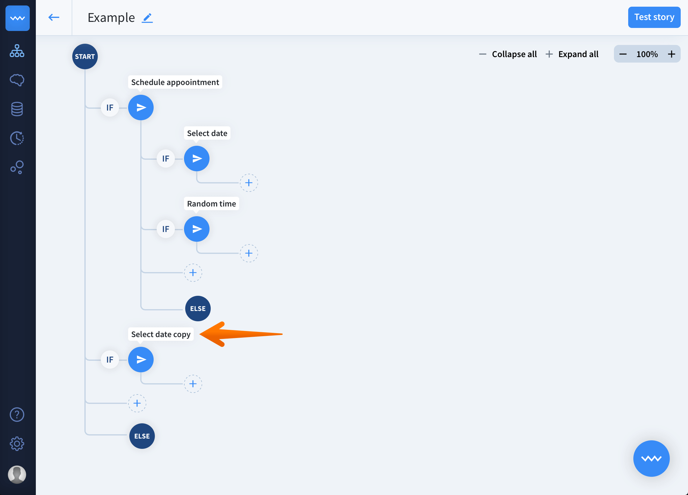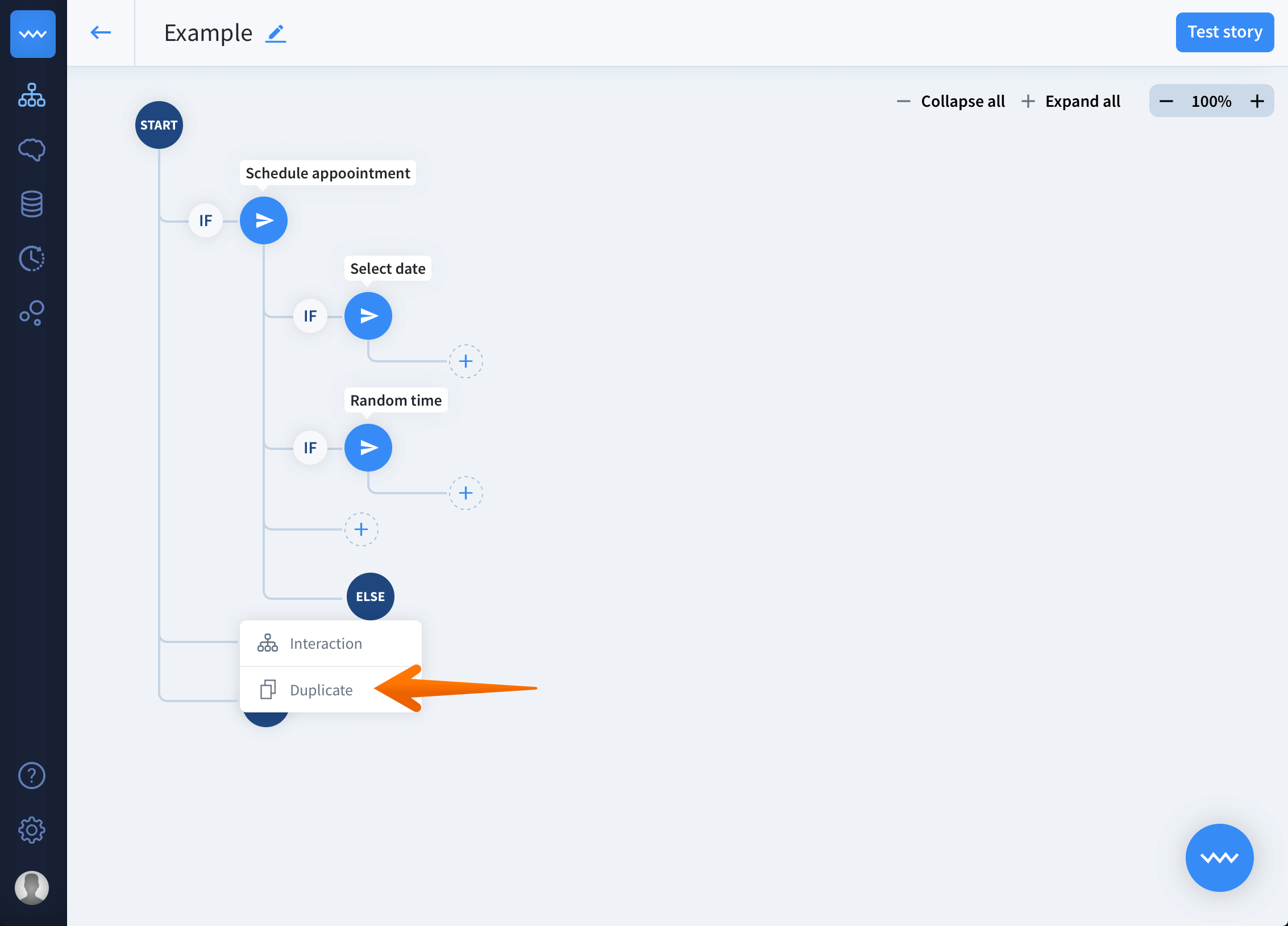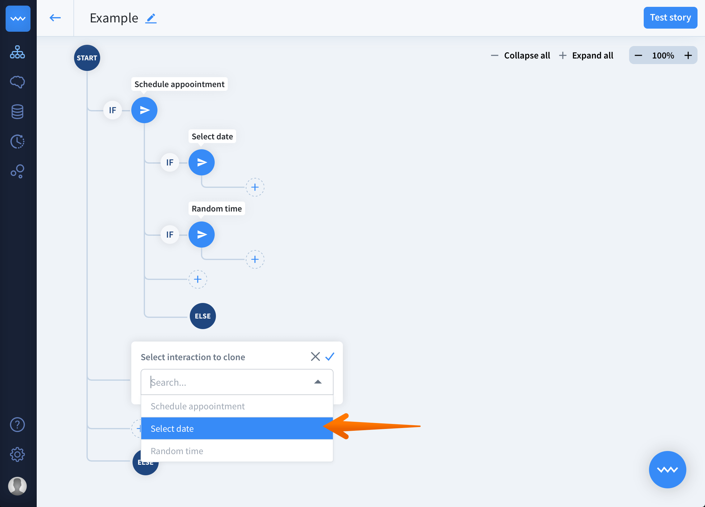 Create Stories faster using the cloning tool that allows you to make a copy of an existing interaction. The copy can be placed anywhere in the scenario and freely edited.