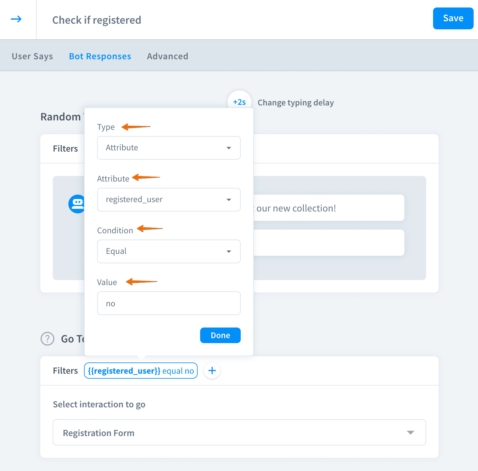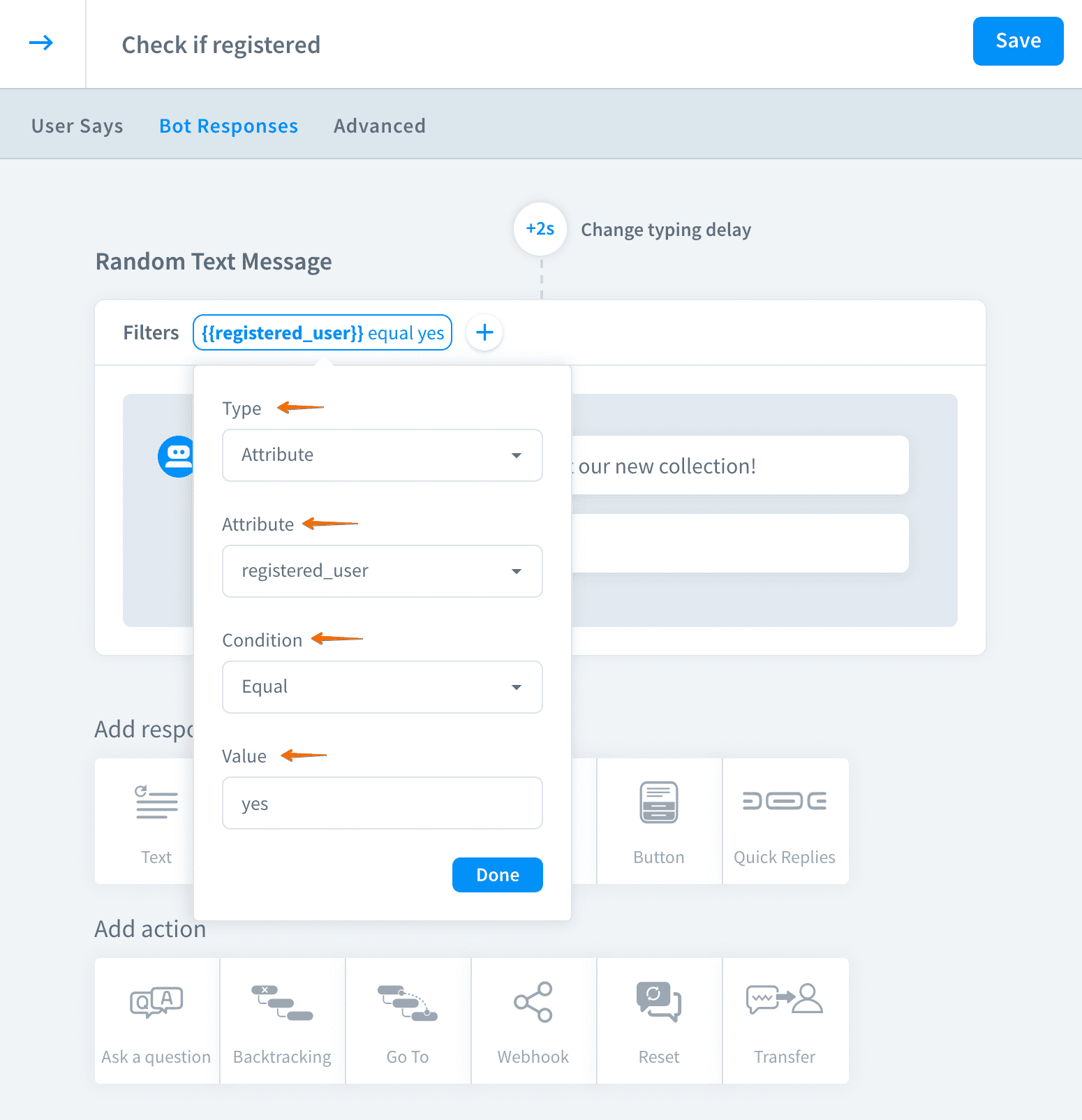 Similarly, add another bot action and apply a filter to it. The go to action that leads to the registration form will be shown only to the users without the account.