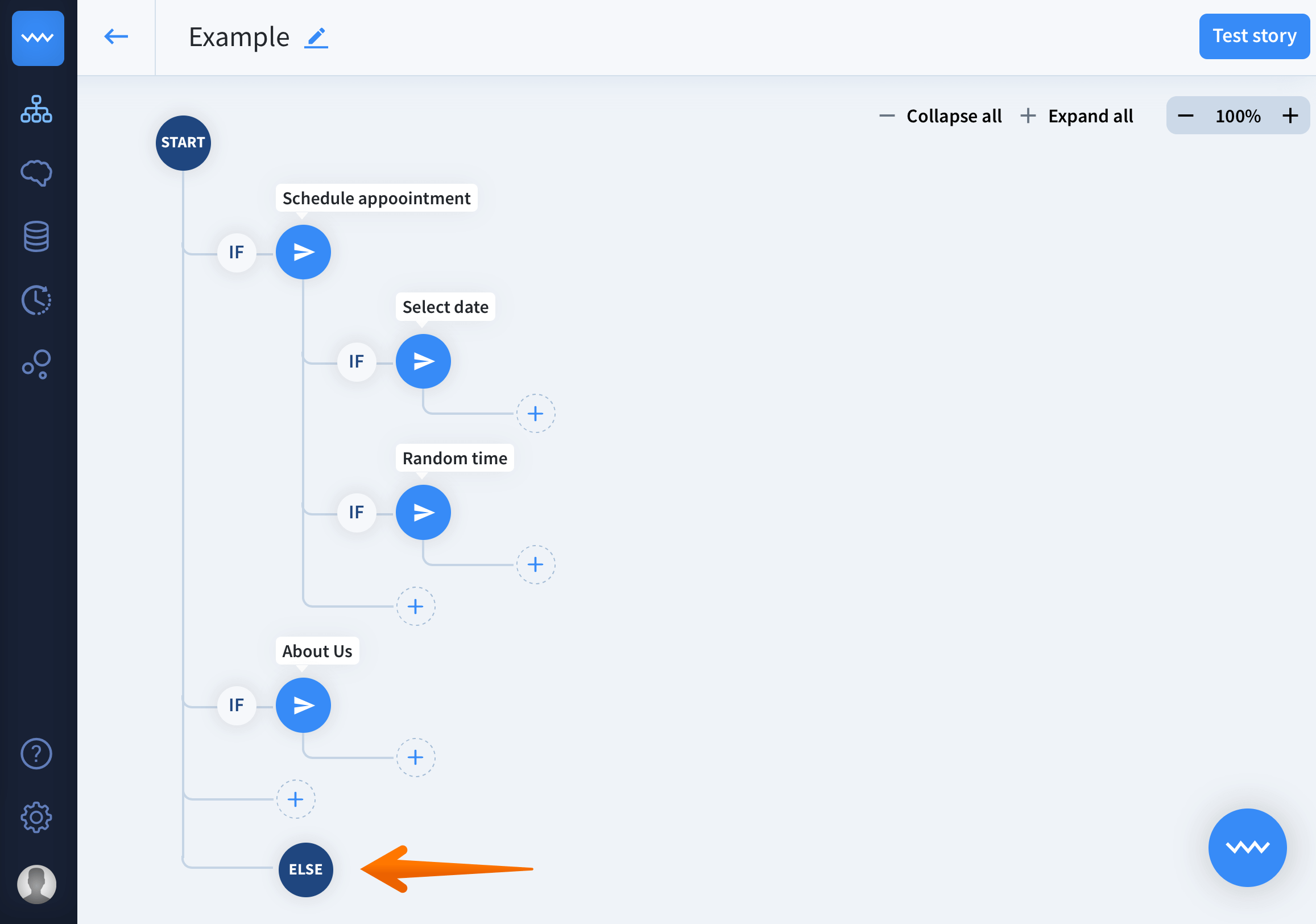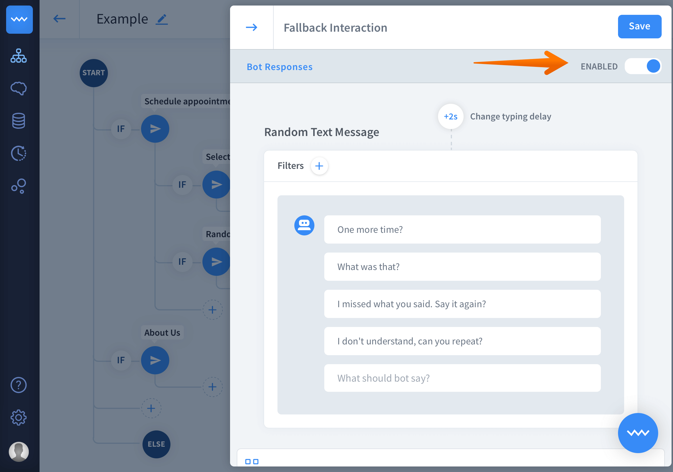 The fallback interaction controls the conversation flow by showing a general message when the bot cannot match the user query with any of the interaction. The interaction prompts the user suggesting rewording the phrase, showing possible options or performing specific actions.