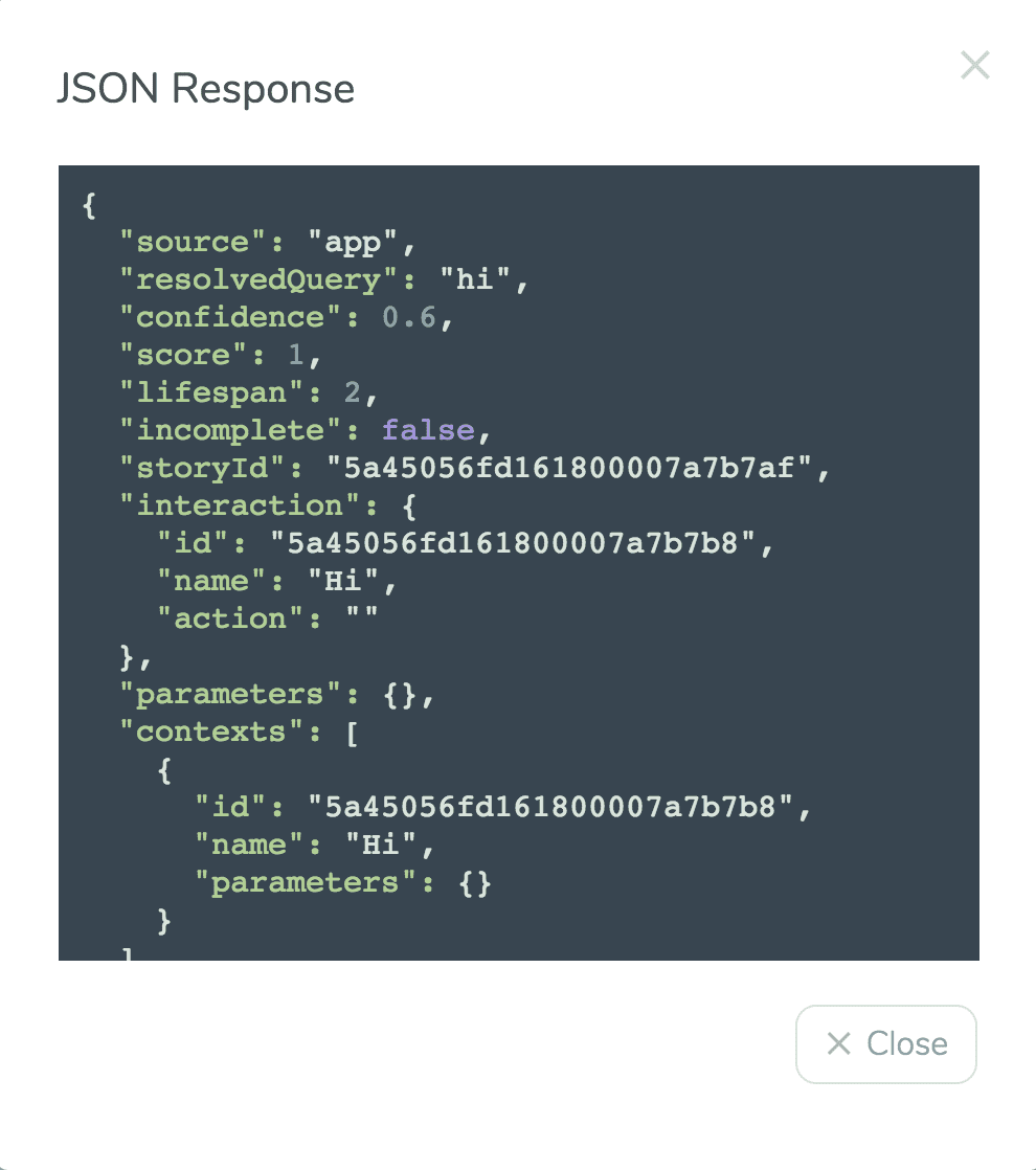 You can view the conversation as a JSON. Click the brackets on the top bar, to see the JSON from the last interaction. To view another point in the conversation, click the avatar next to it.