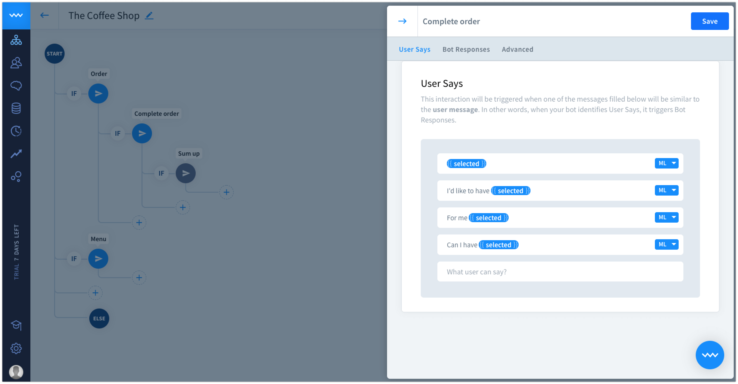User Says - type here what the query that triggers this interaction. You can decide the matching system individually for each phrase.
