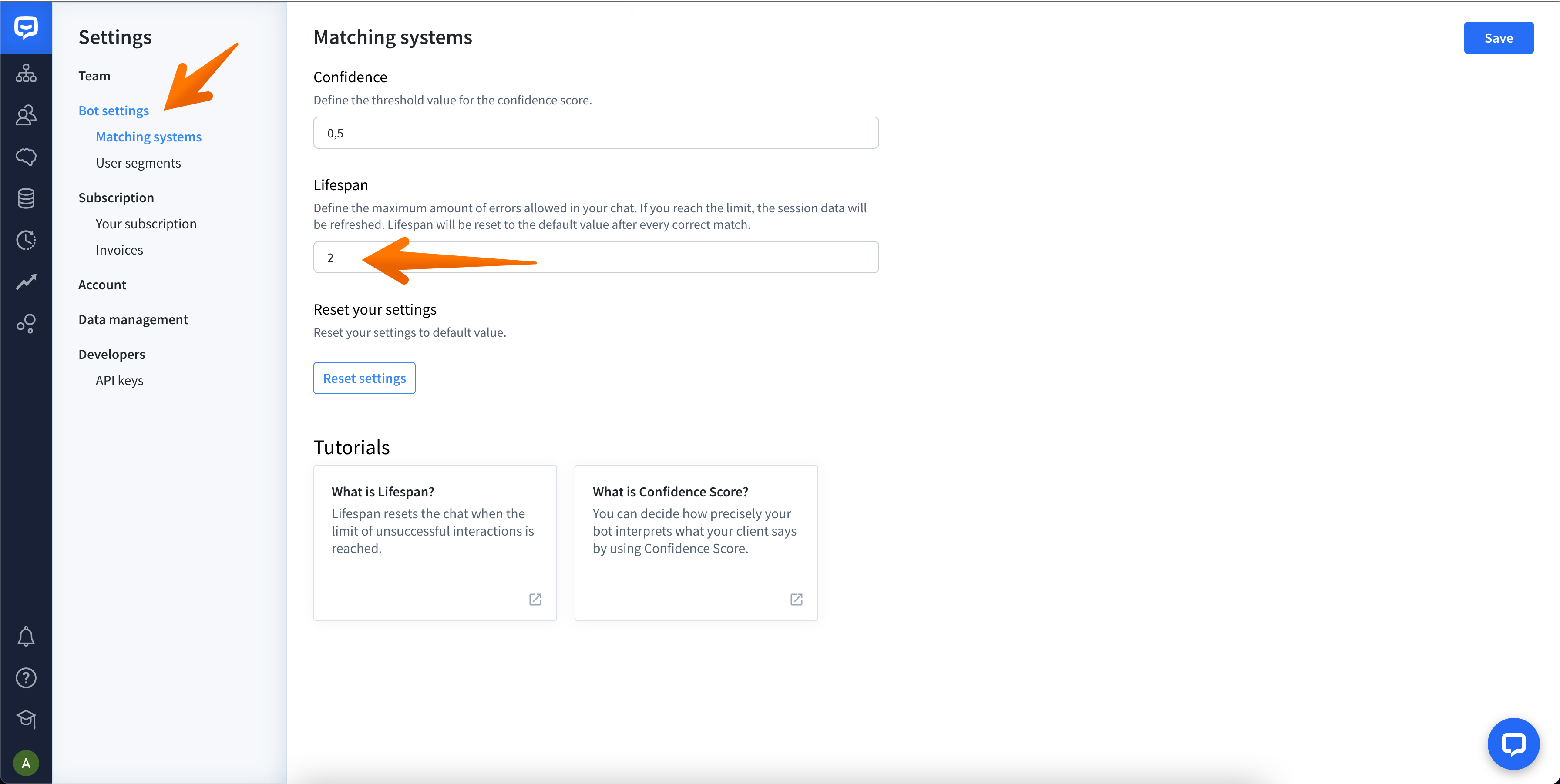 It may happen that your chatbot doesn’t understand the user’s inquiry. Users can misspell words or use unpredicted words. Set the value of lifespan to control the number of allowed failed matches. When the lifespan reaches 0, the whole context of the story resets, and the user can start the chat from the beginning.