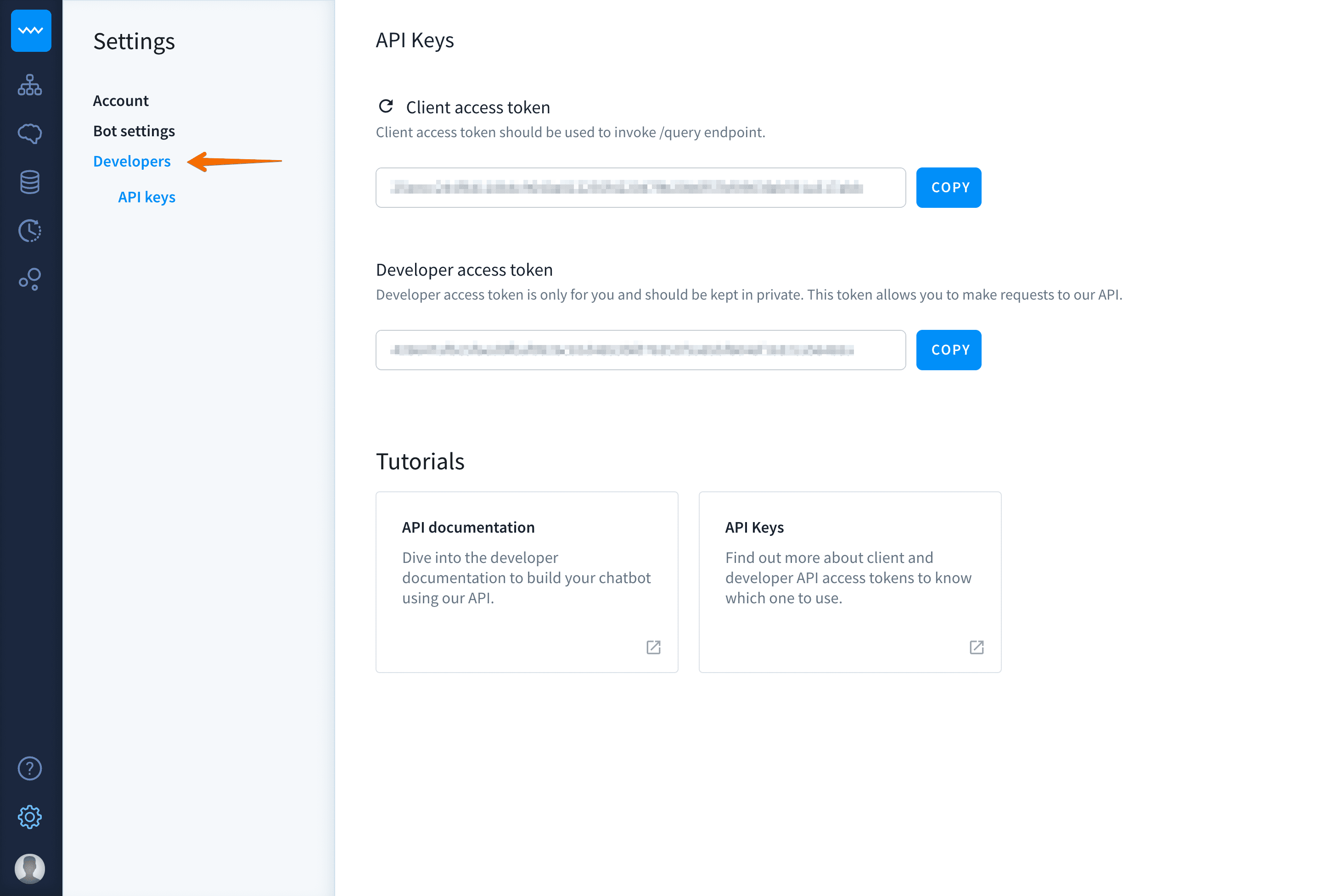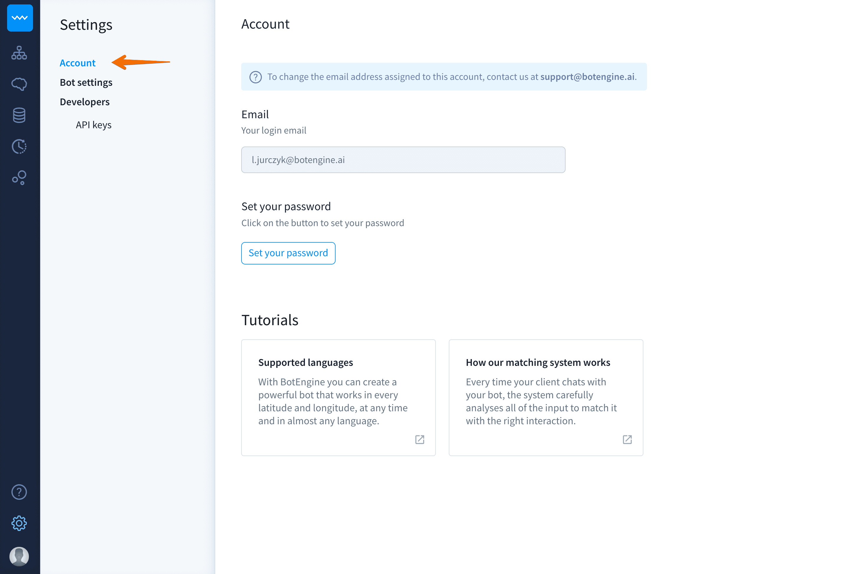 Click on the settings icon on the left sidebar to view your account details and bot settings. Here you’ll find three main categories: Account, Bot Settings, and Developers. Let’s walk quickly through each of them.