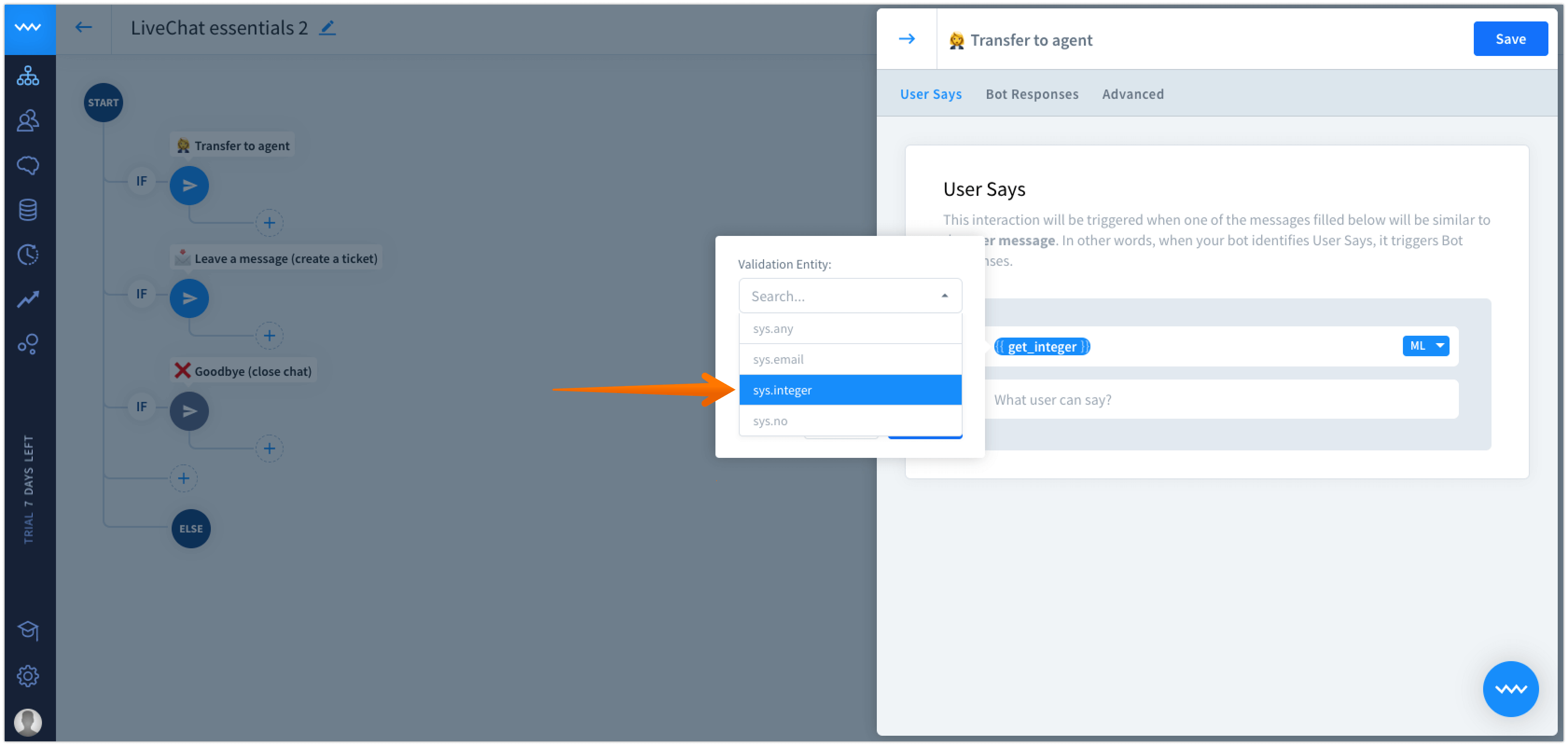 {{ sys.integer }}and type here the user says message.