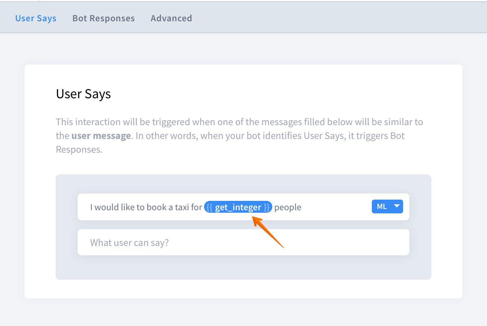 In the user says section, type two curly brackets