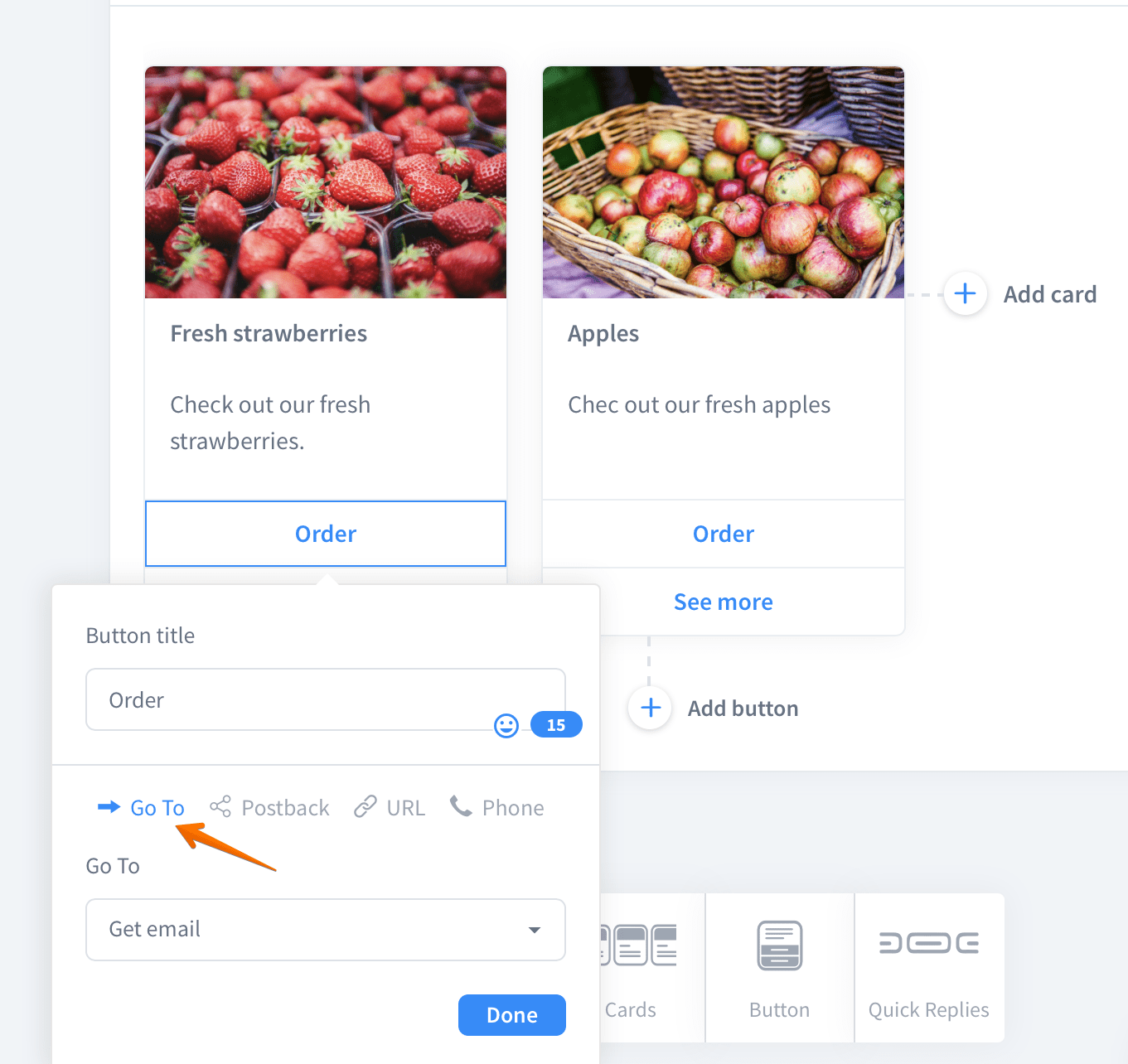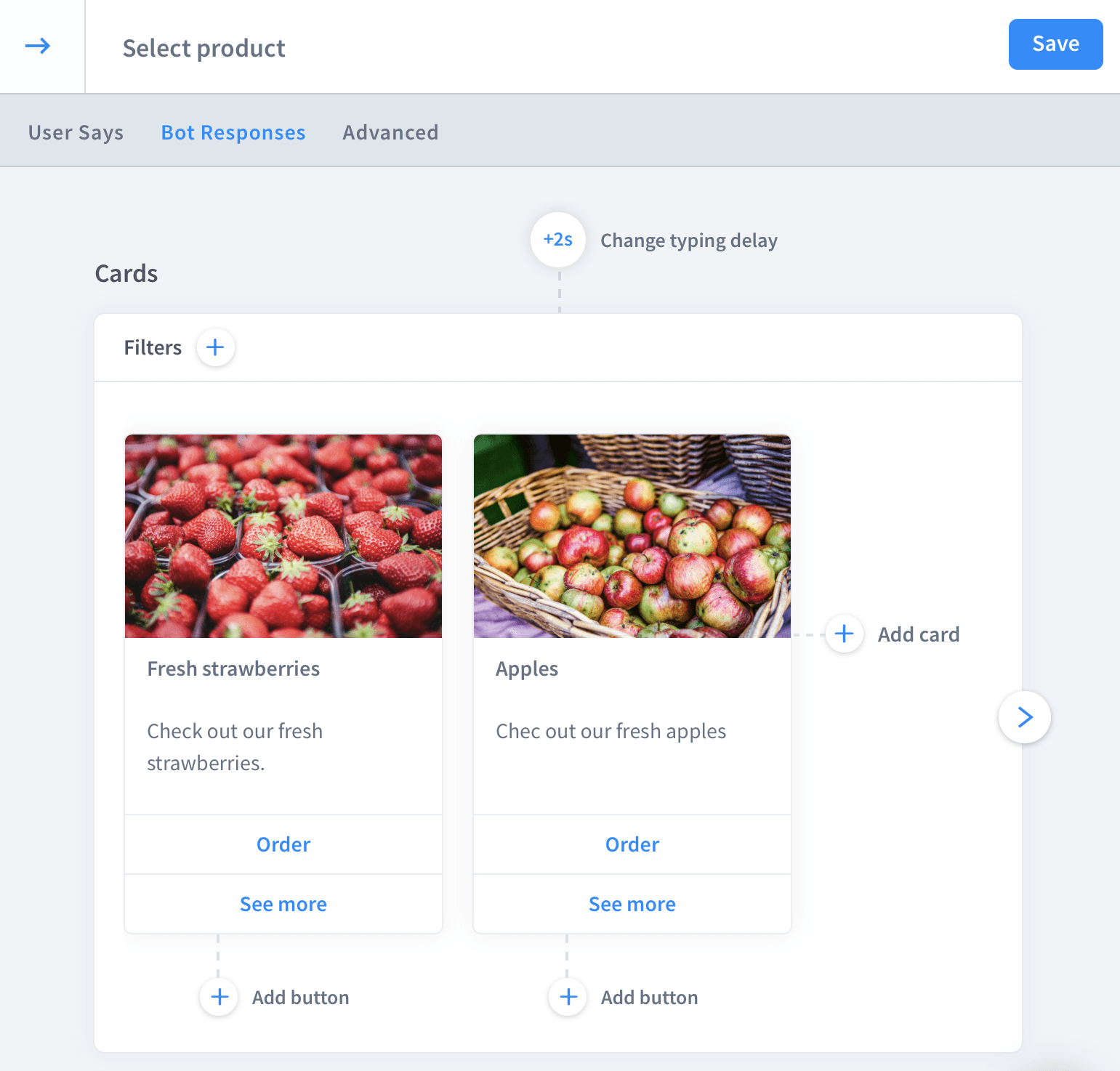 Go toaction for theOrderbutton to navigate the user to the next interaction. Remember to complete also User Says fields so users can enter this part of the story.