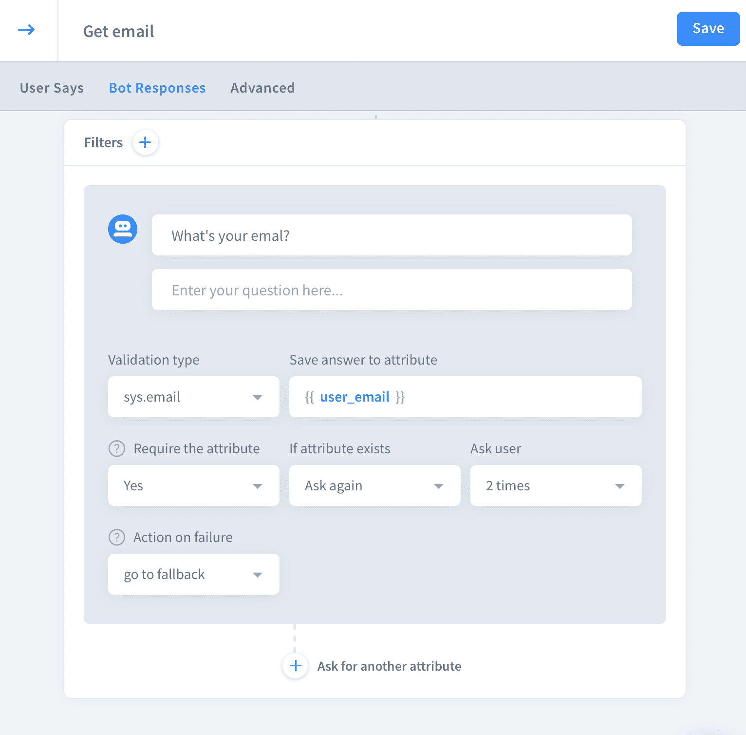 Validation typechoose from the dropdown menu the system entity{{ sys.email }}. Name the attribute to save the value of the attribute to. Complete the other fields according to your preferences.