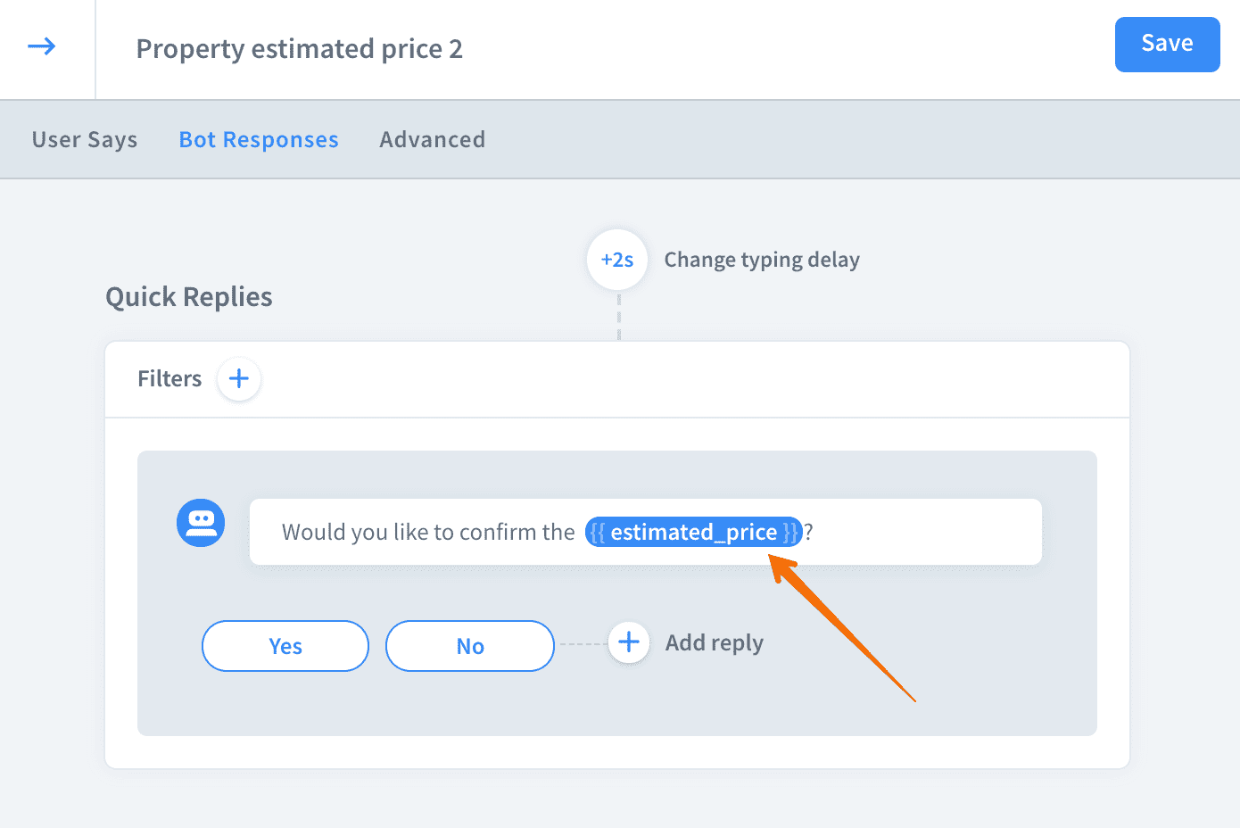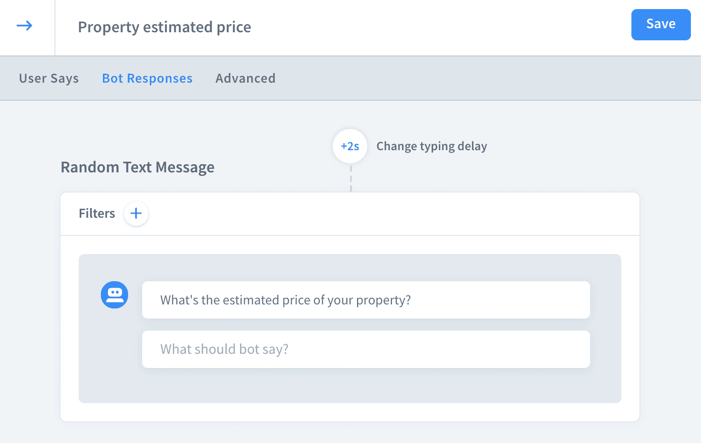 Go to the bot responses and add a text message. This is the moment when the bot asks for the estimated price.