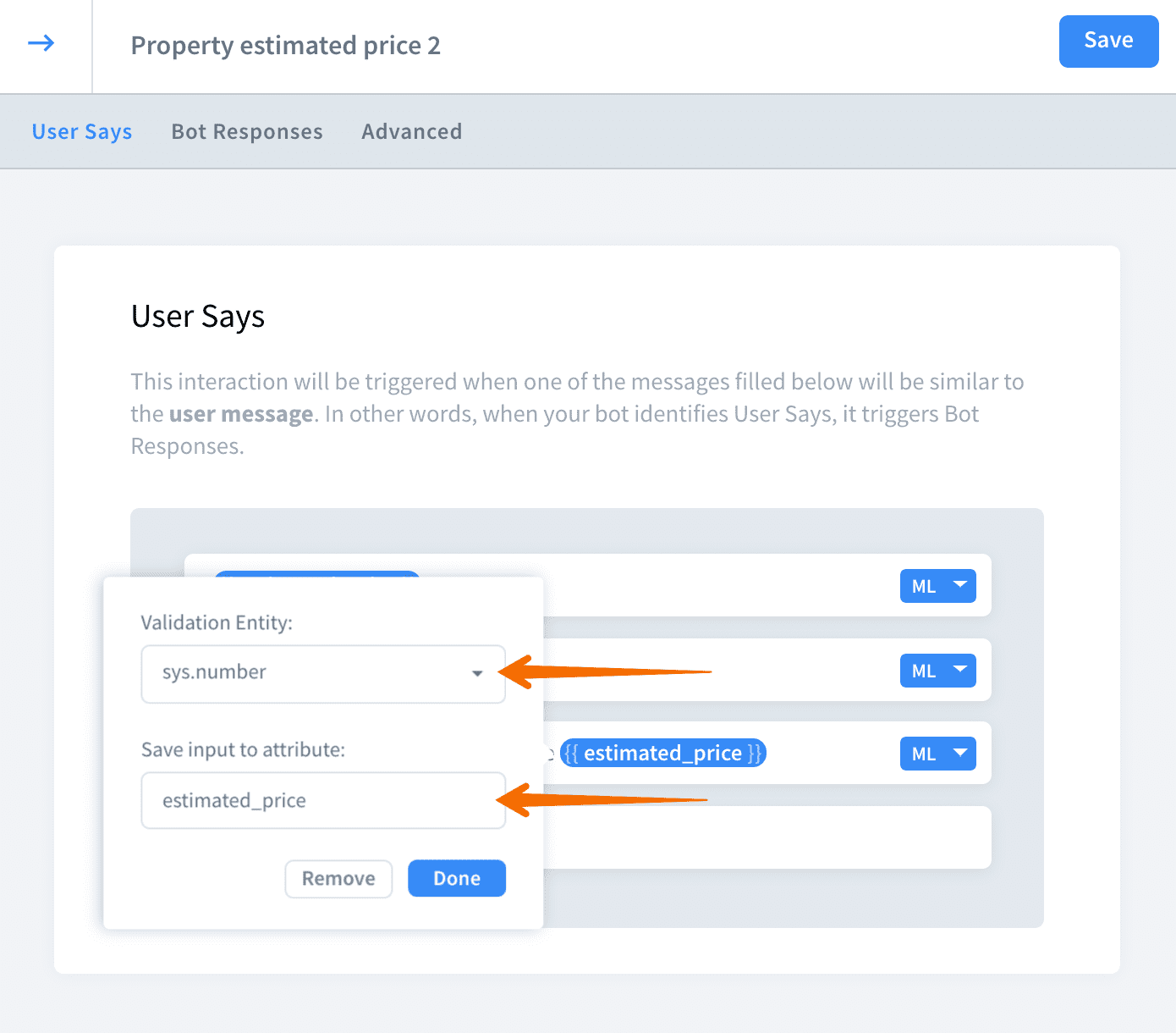 To understand how this entity works, we’ll create a short scenario for a real estate chatbot that gathers information about advertised properties. To recognize the estimated price entered by our potential customers, we’ll use the sys.number entity.