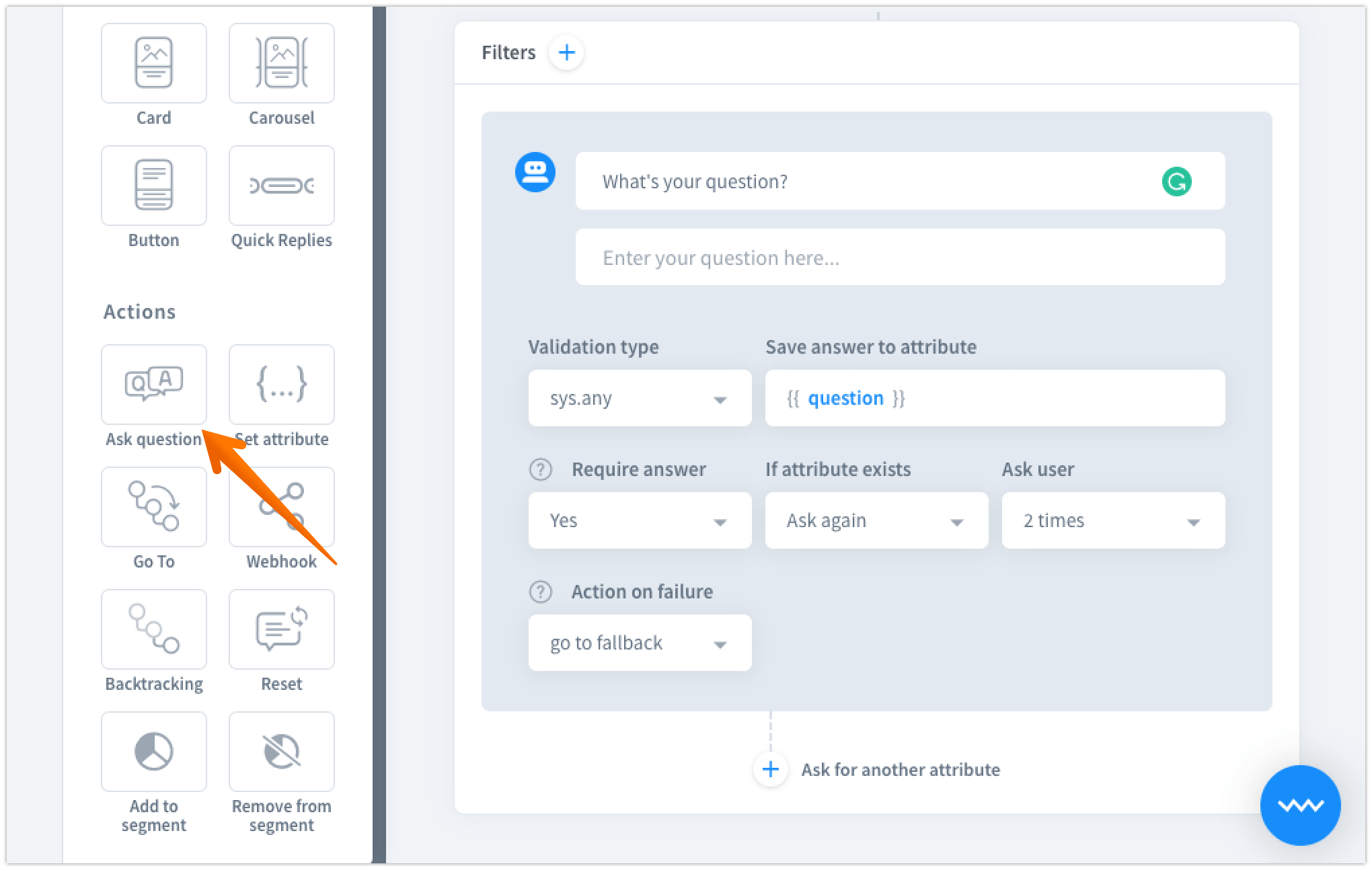 Create a new storyand name itGet phone number. Inside the storyadd a new interactionwith the same name. Ask a Question is the best bot action to collect user data. Add it to the bot responses.