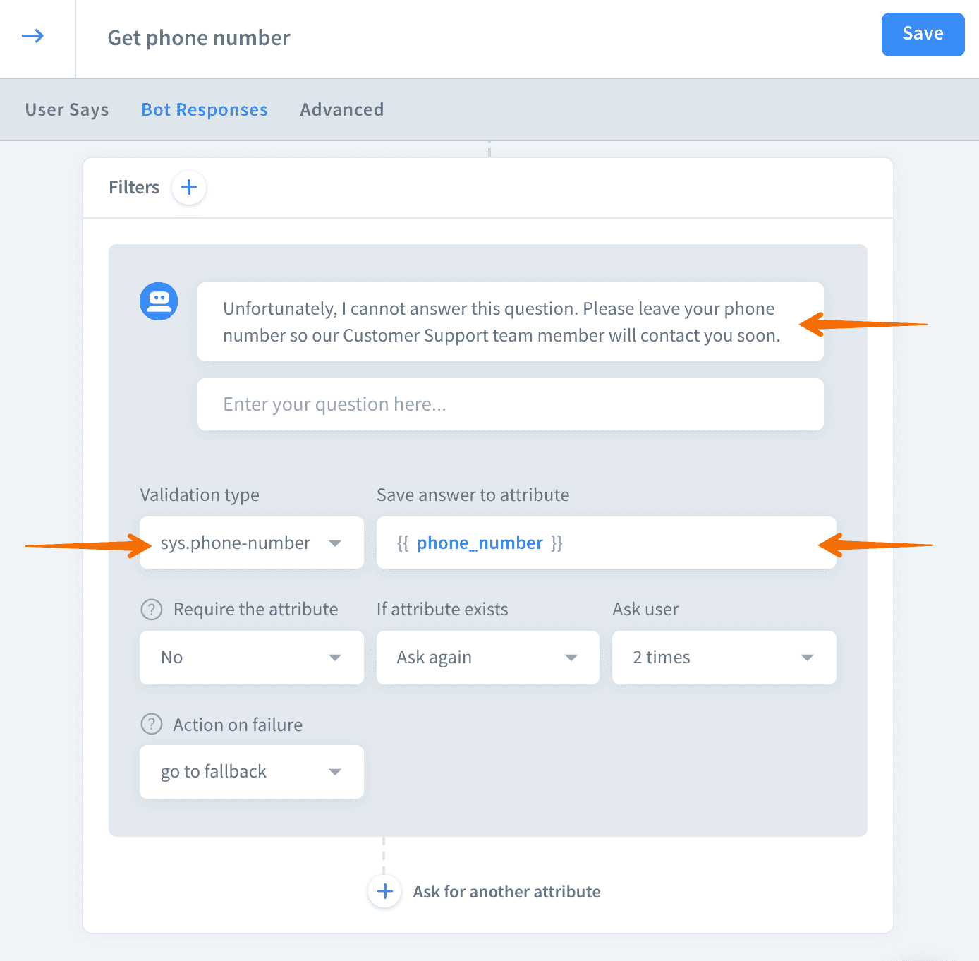 select the phone-number system entityas the validation type. Also, decide the name for the new attribute.