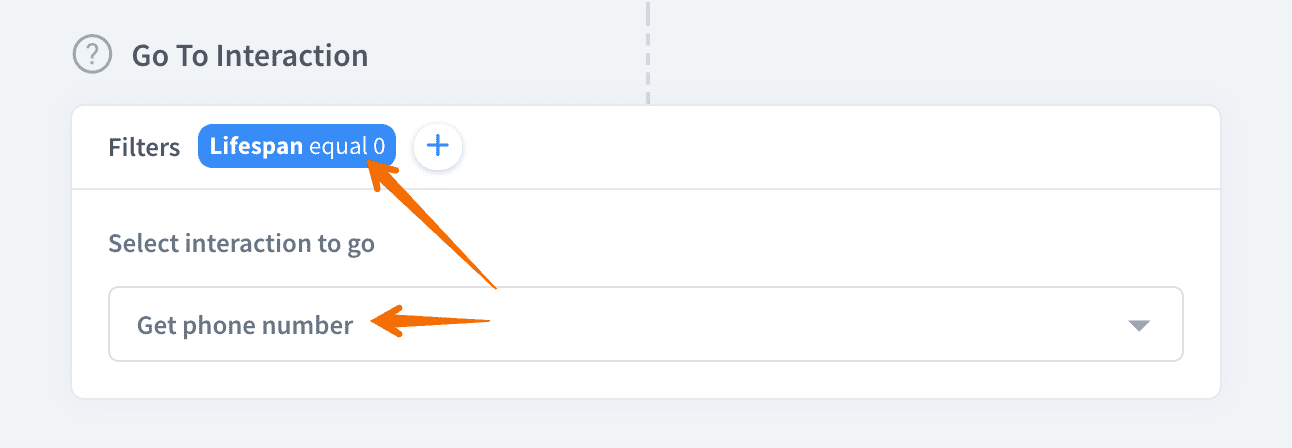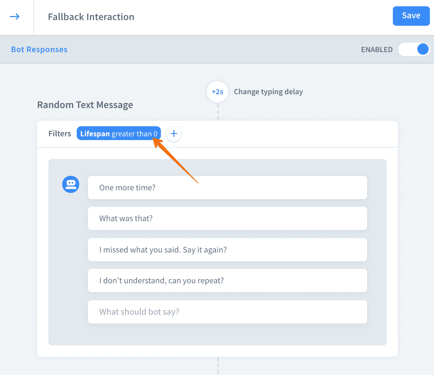 Let’s connect this interaction with the default fallback interaction.Add the following filter:Lifespan > 0to your default fallback response.