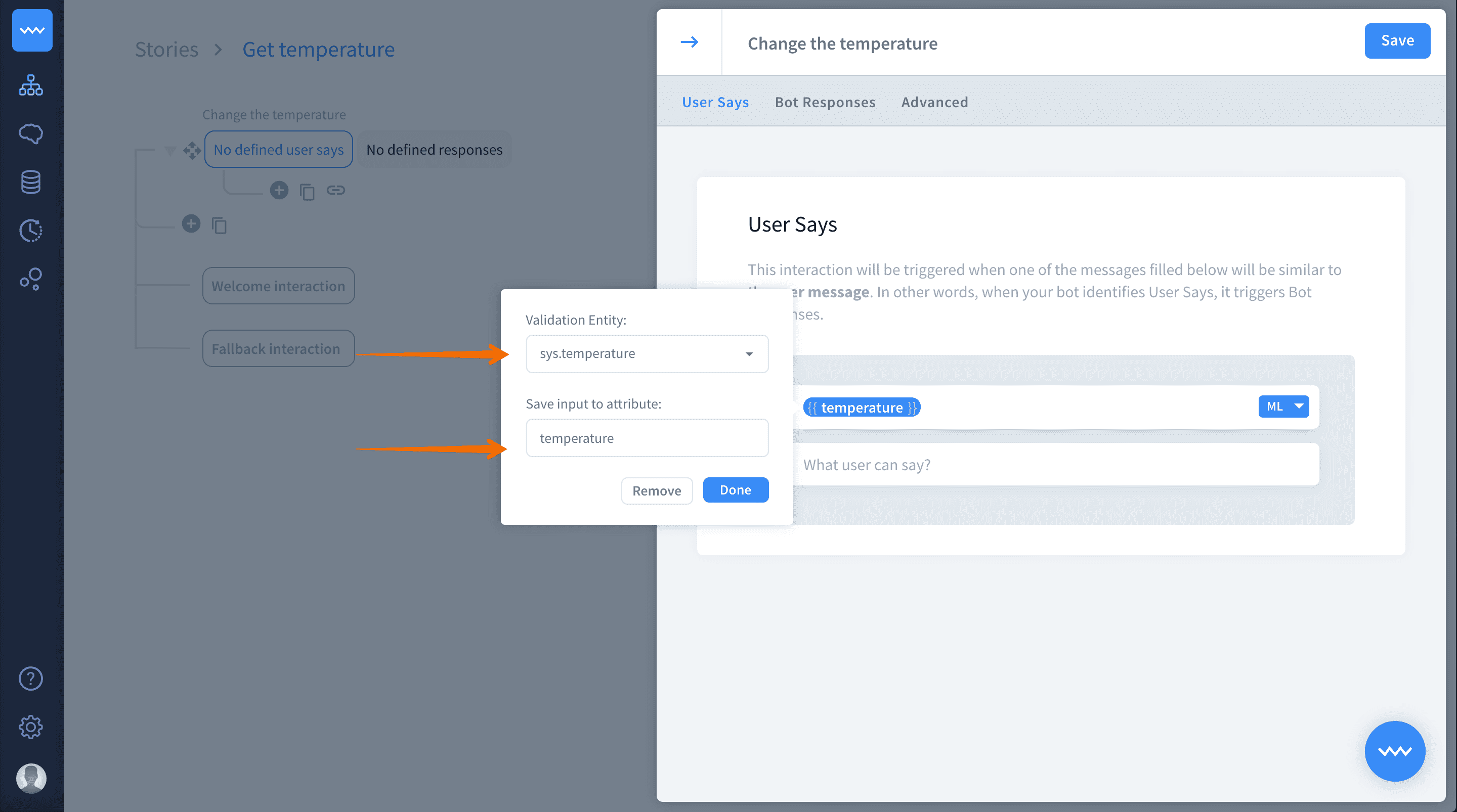 Create smart interfaces that can quickly recognize the temperature value in all popular units, using the sys.temperature system entity. The system captures the value and the unit entered by the user and saves them to the attribute, so you can reuse this information within the chat or pass it to your external services.
