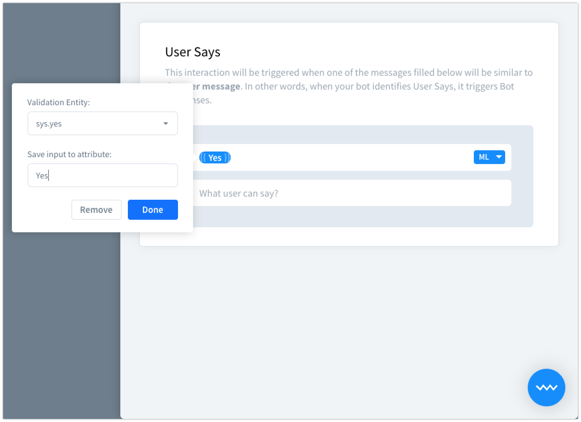 Sys.yes and sys.no entities are built in elements you can use to recognize your user’s input without creating endless user says lists. Don’t predict all the ways your users say yes or no. Use the system entity instead that will not only recognize the correct answer but also memorize it so you can reuse it within the ongoing chat or pass it to your web services.