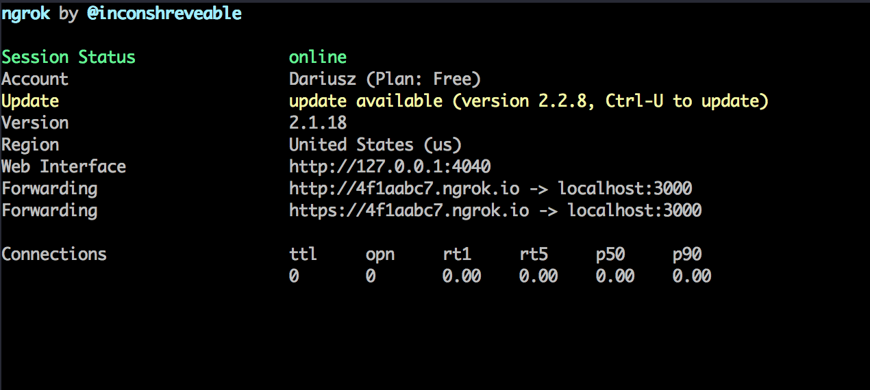 index.jsfile, run the following command:node index.js3. Run ngrok in a new terminal window to listen on the port 3000../ngrok http 30004. Now you should see a similar screen the the one below. Note that the address in theForwardingline states the public address of your webhook. In this case, it ishttps://4f1aabc7.ngrok.io. Save this address for later.