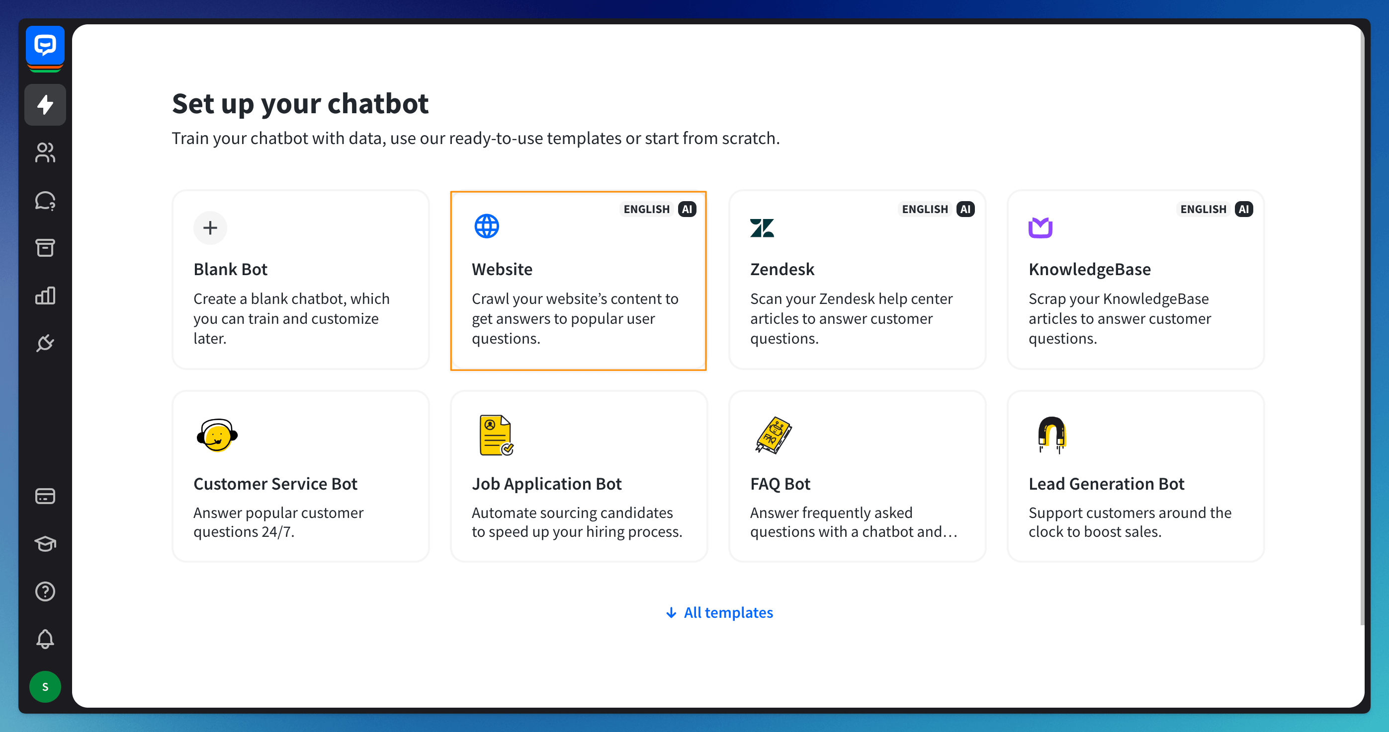 To create a fully operating chatbot, you don’t need any other tools or apps. The bot-building process is fully automated and simple. All you have to do is provide your website URL or source file, which will be used to train your chatbot. You can publish your bot in seconds using one-click integrations with popular messengers, and live chat services, or use our built-in Chat Widget.