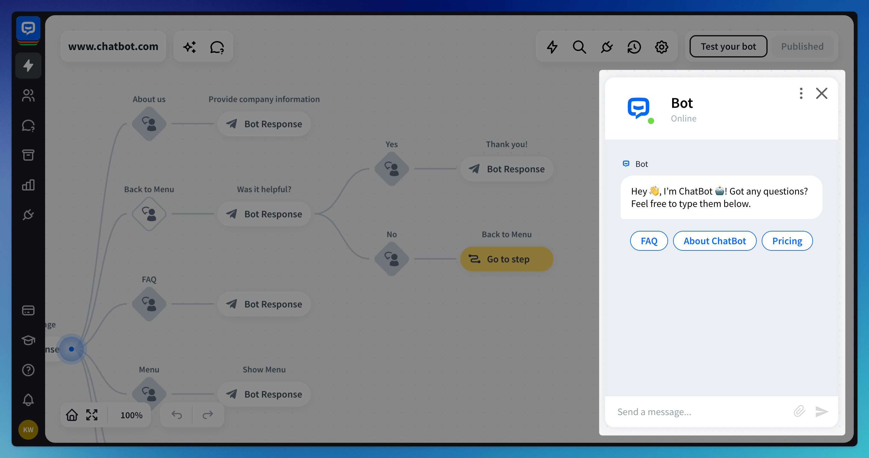 Once you open the Testing Tool, you will be able to chat with your chatbot without implementing it on your site. You can trigger all the responses and actions from this place, but please that some actions will be only simulated (incl. “transfer to agent” or “close chat” actions).