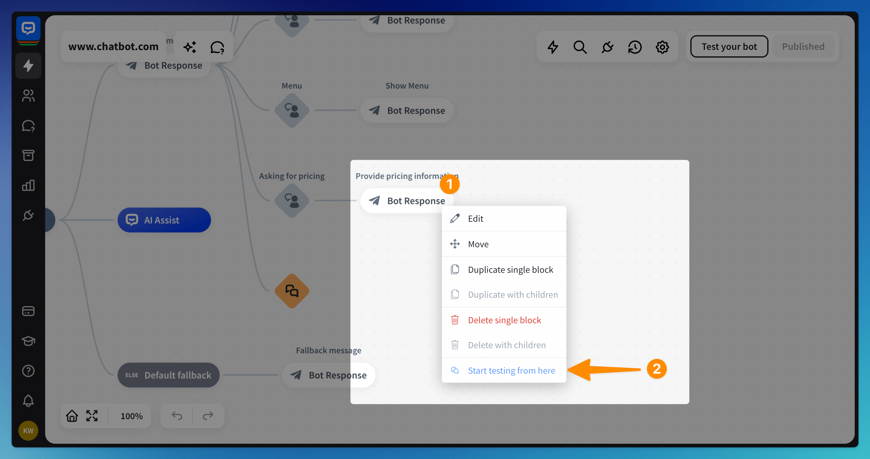 If you need to test only a specific interaction or action, you can start testing from any block in your flow. To start, right-click (1) on the desired block and choose the “Start testing from here” (2) option from the menu.