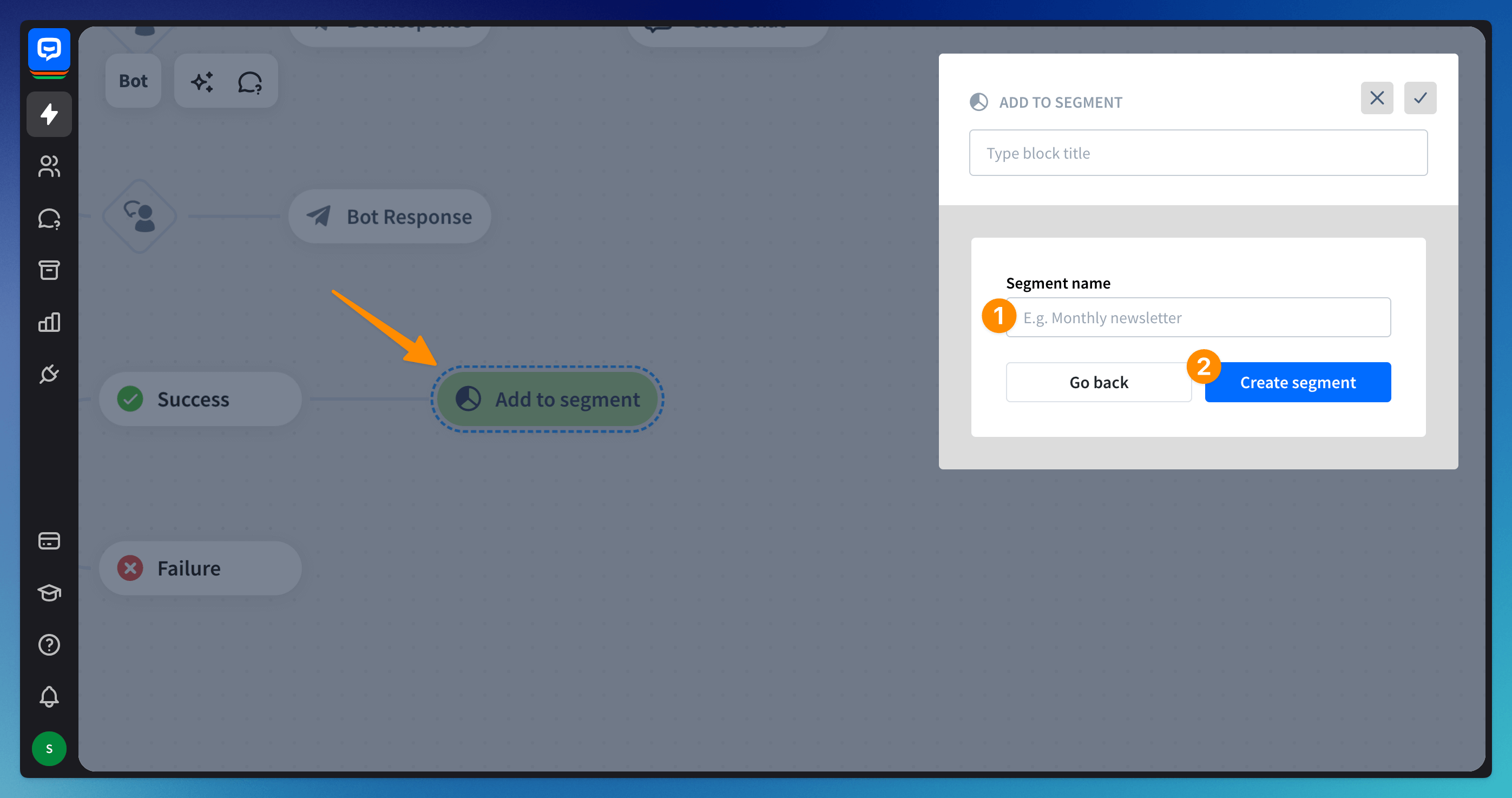 You can use actions directly on the bot flow to manage your segments - you can automatically add and delete visitors from segments with dedicated actions - Add to segment and Delete from segment. The visitor will be added or deleted from the list when the block is triggered during the chat.
