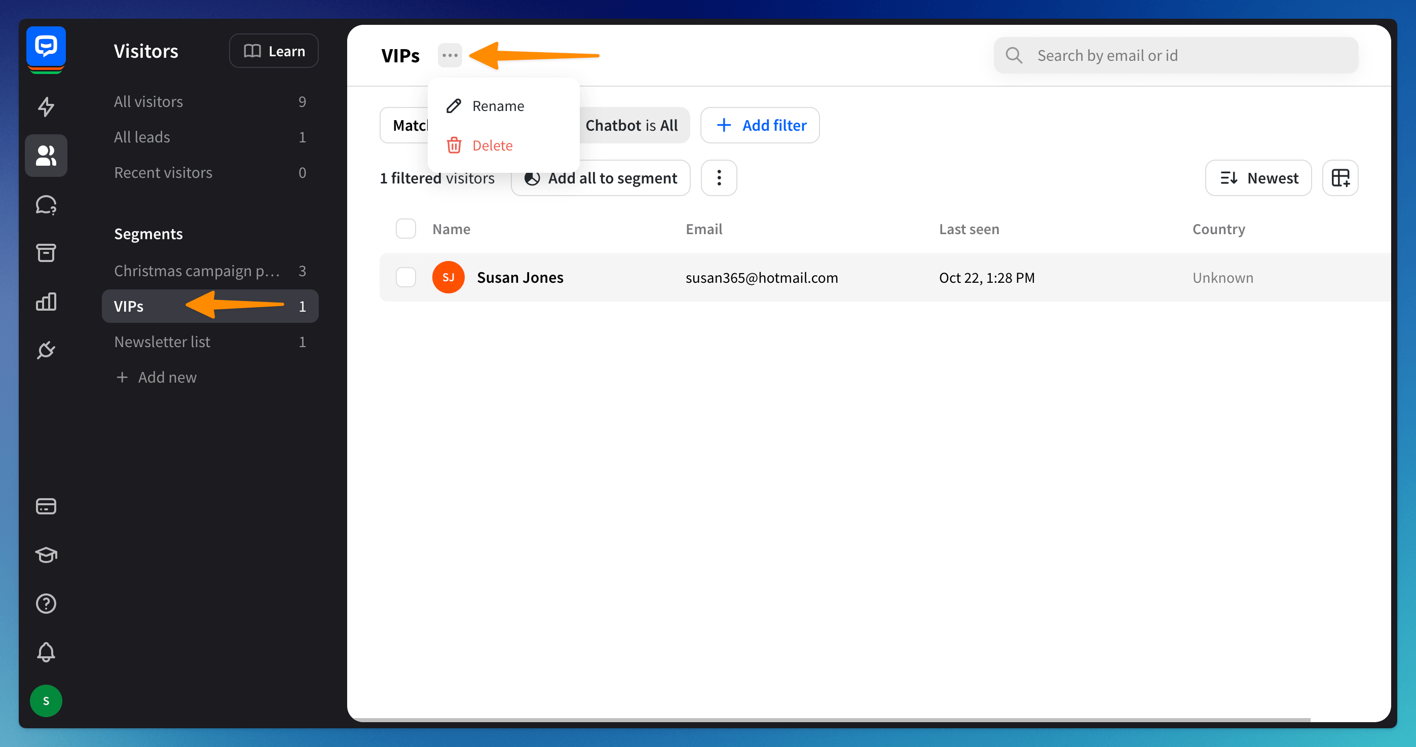 Go to the Visitors section. Choose the segment from the list. Click the 3-dot symbol next to the segment name. Rename or delete the segment.
