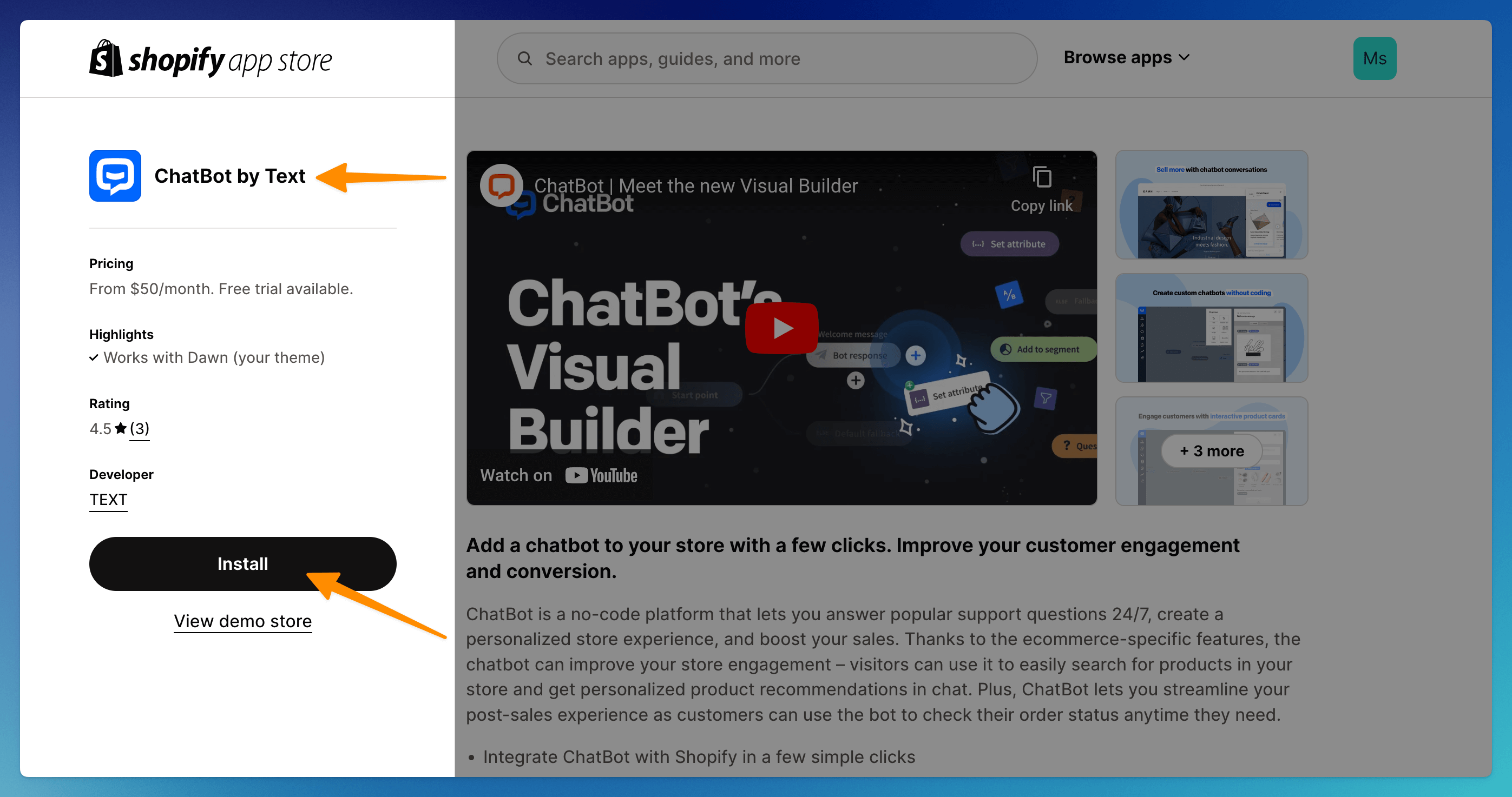 Log in to your Shopify store admin panel. Go to the Apps section and search for the ChatBot by Text app.