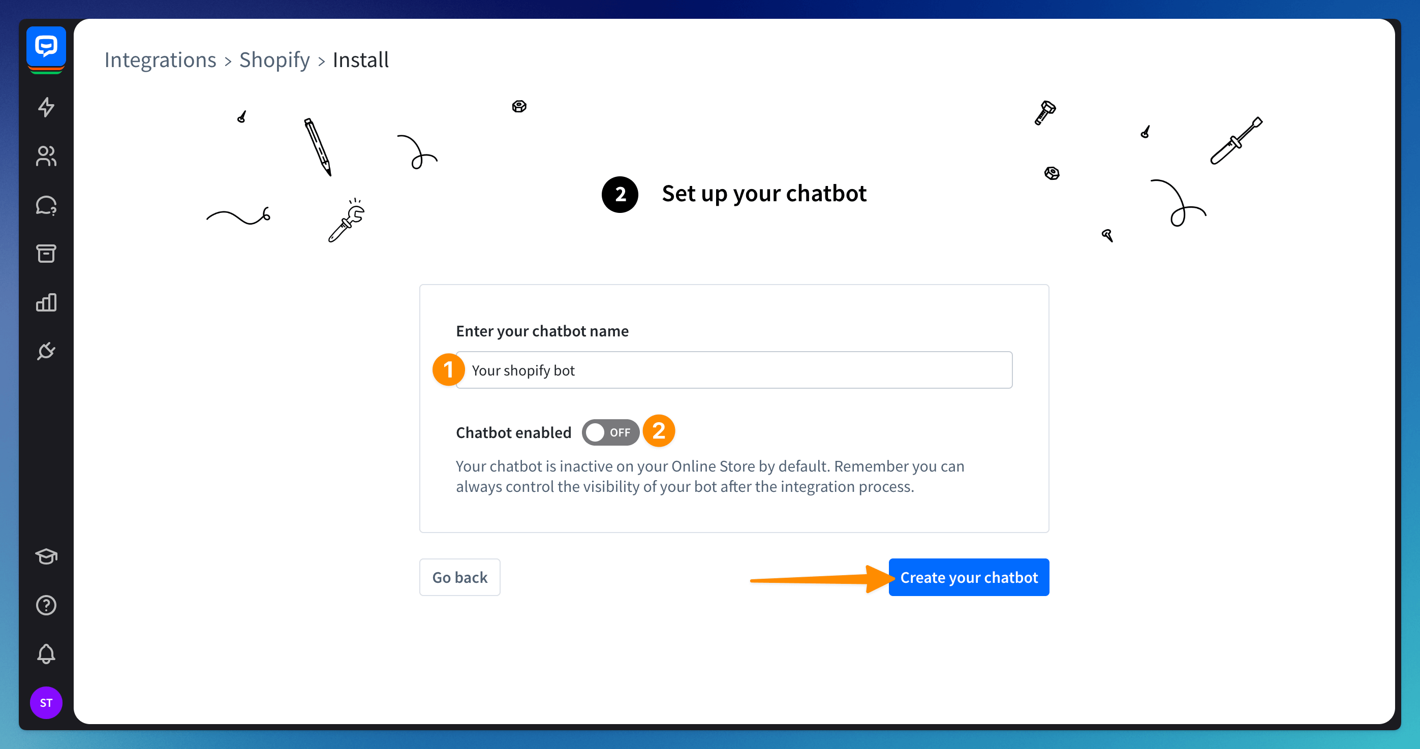 In the Chatbot enabled section, you can decide whether your chatbot should be active on your Shopify store when the integration is complete. If you turn this setting on, the chatbot will appear on your store even if your bot is incomplete.