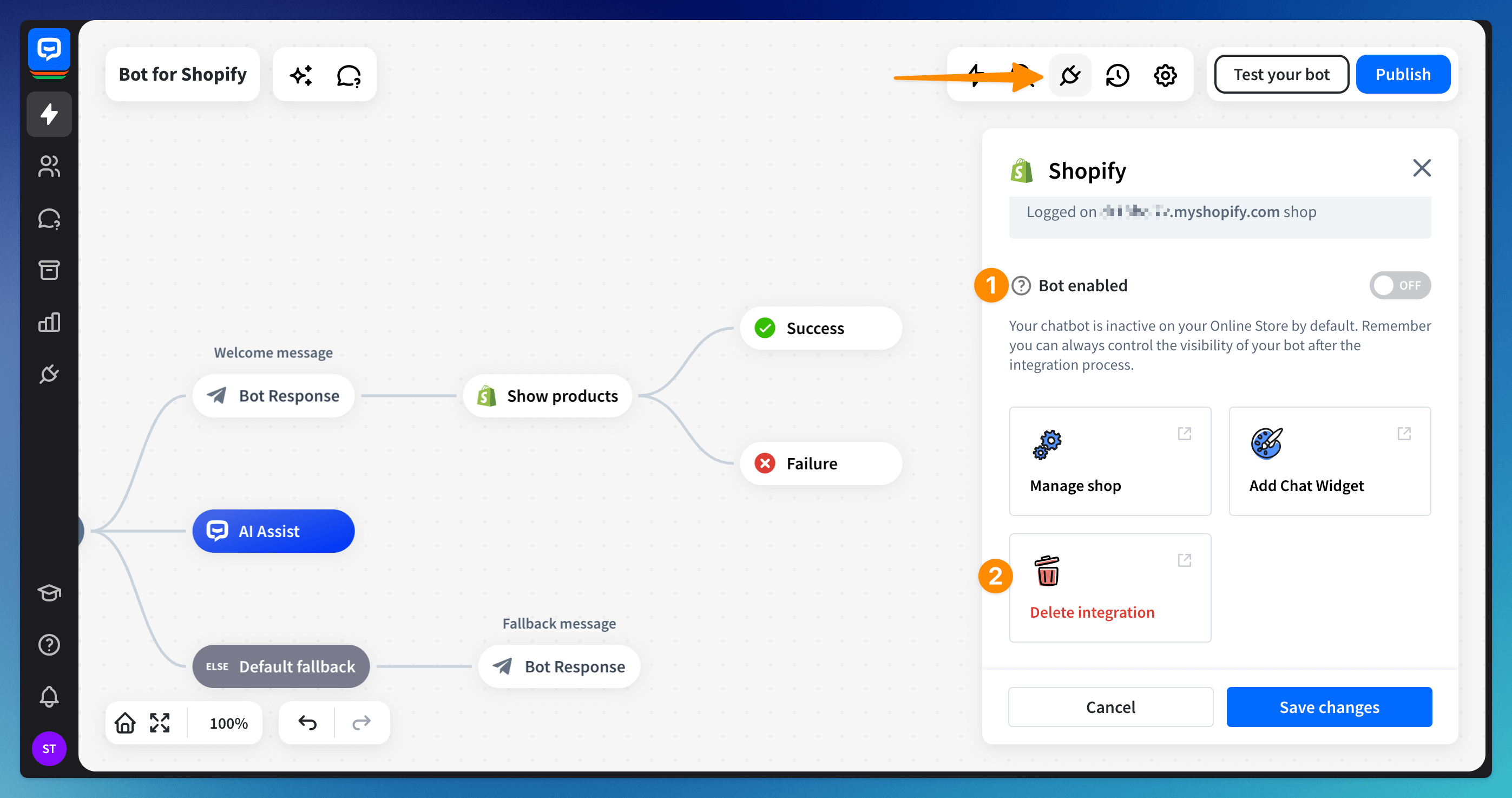 You can manage the integration when you click on it on the Integrations list. You can decide if you’d like to enable or disable the bot in the store (1), if you want to proceed with the store management, or if you’d like to delete the bot from the store entirely (2).