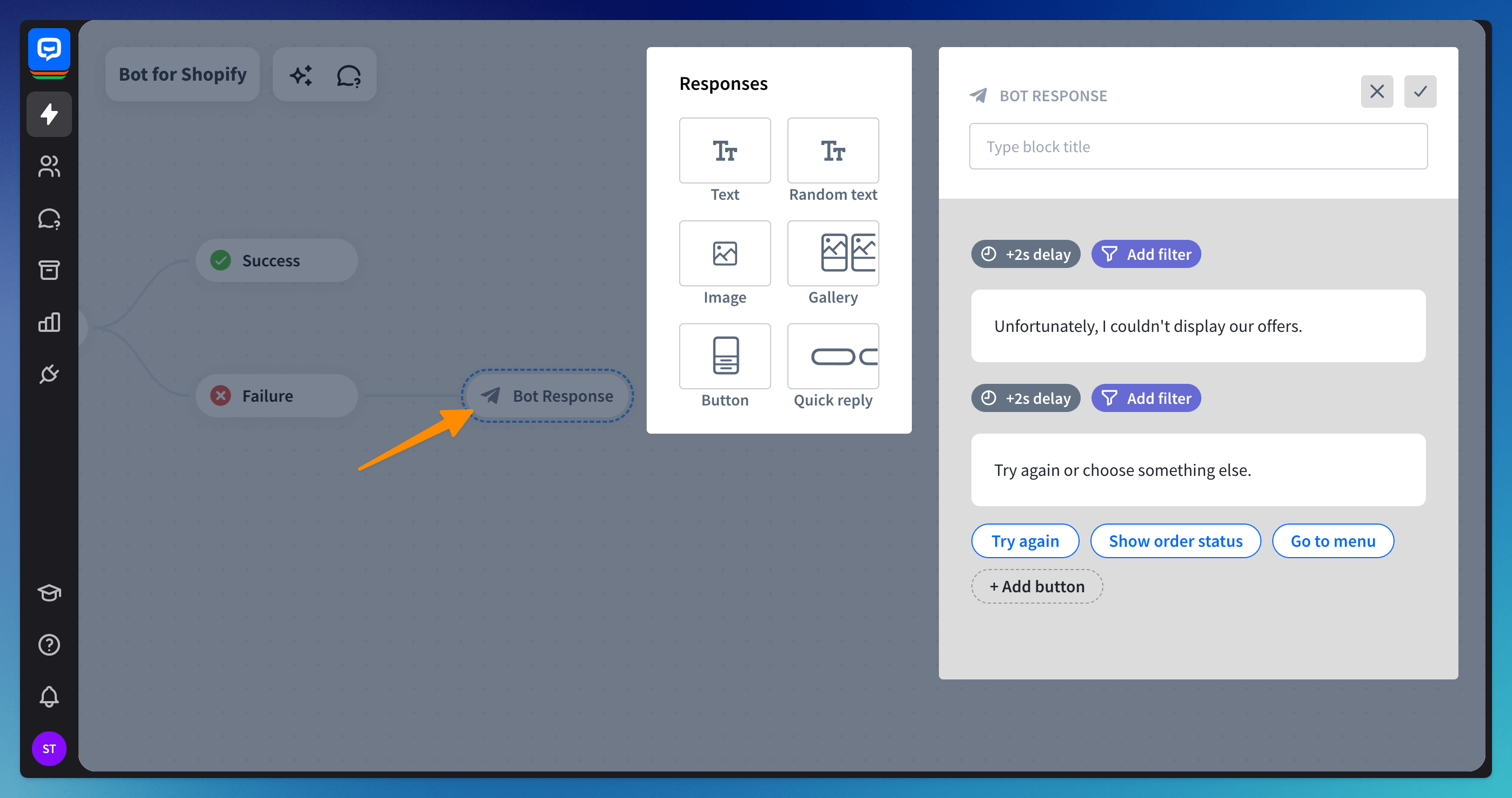 When the bot cannot find available items, it goes to the Failure block. Add a Bot response block there to redirect it. This will let the chatbot start the process again.