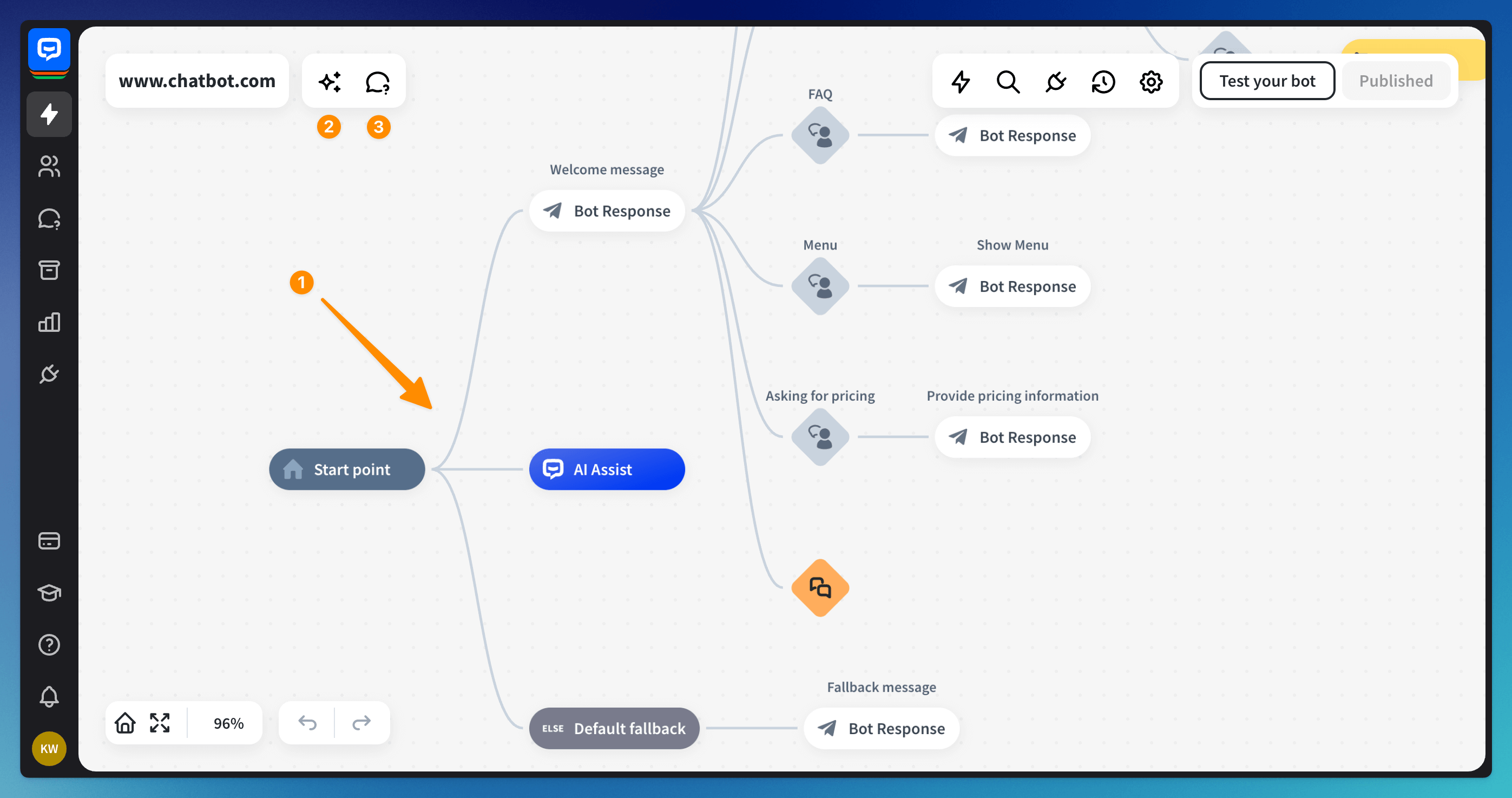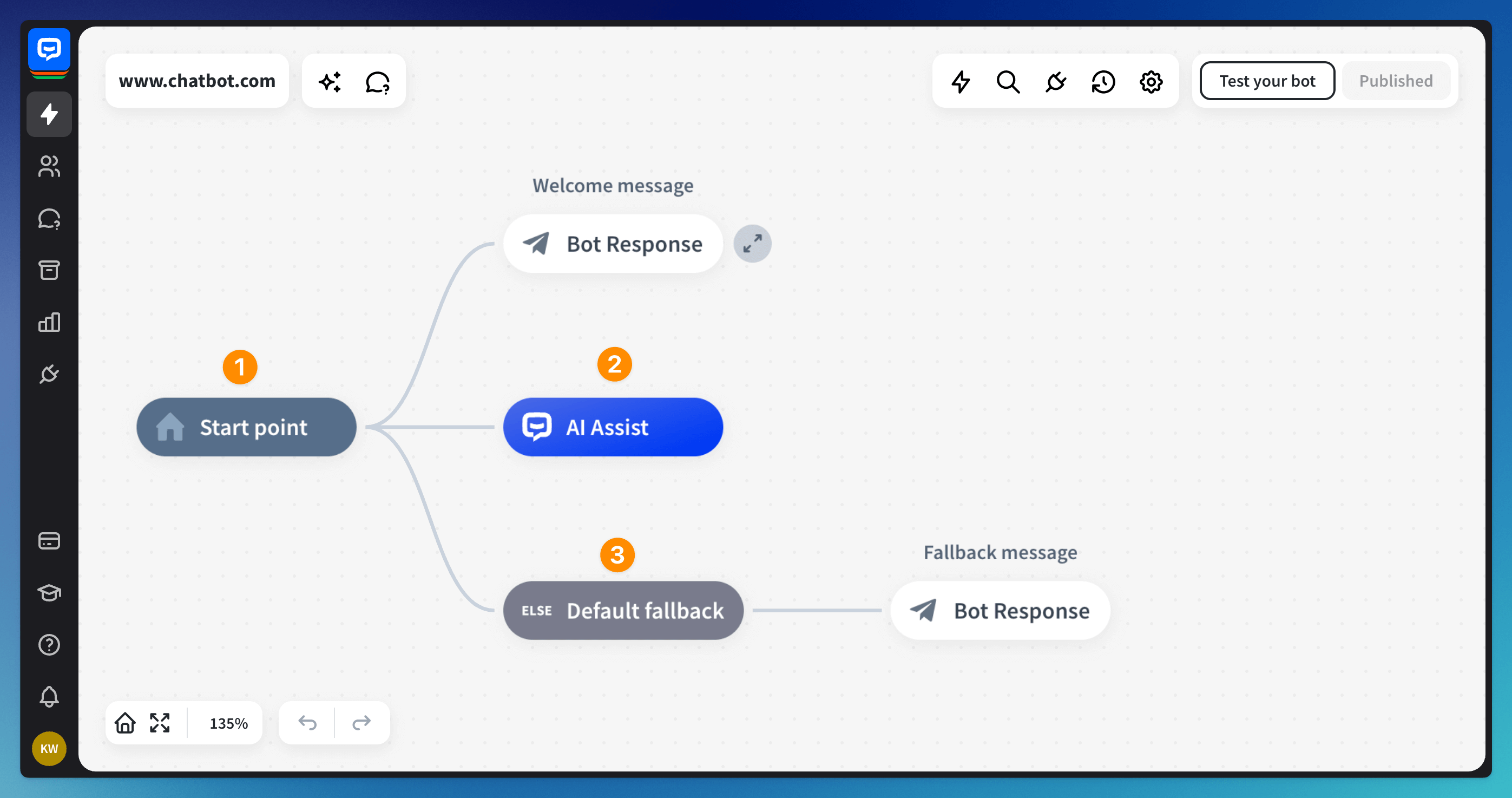 Every bot blow has default elements. The Start point, AI Assist, and Default Fallback blocks are added to help you start the flow. You can develop the bot further.