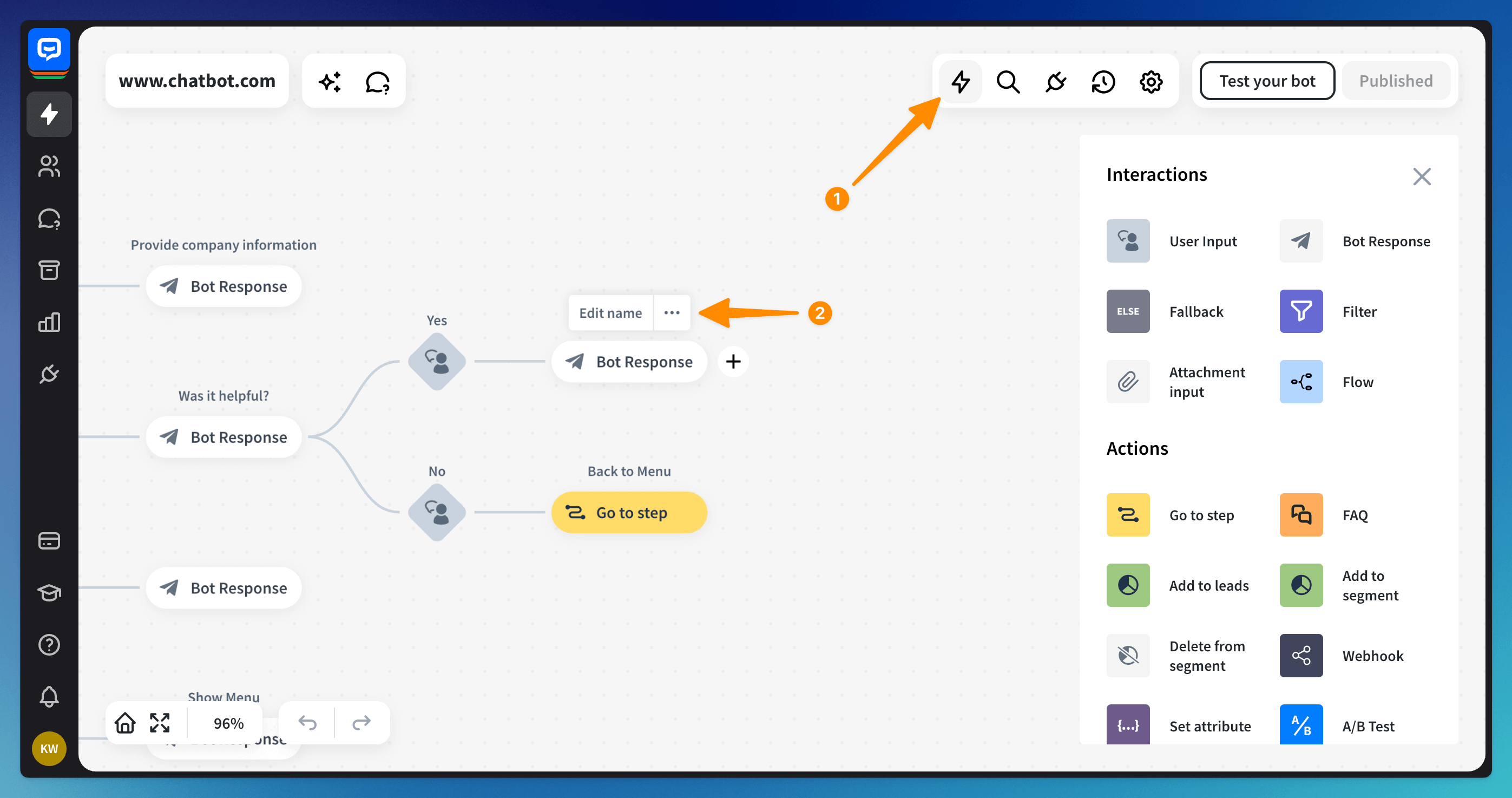 Actions help your bot better navigate conversations, validate user responses, and automate the process of grouping and organizing users. Actions are invisible to users.