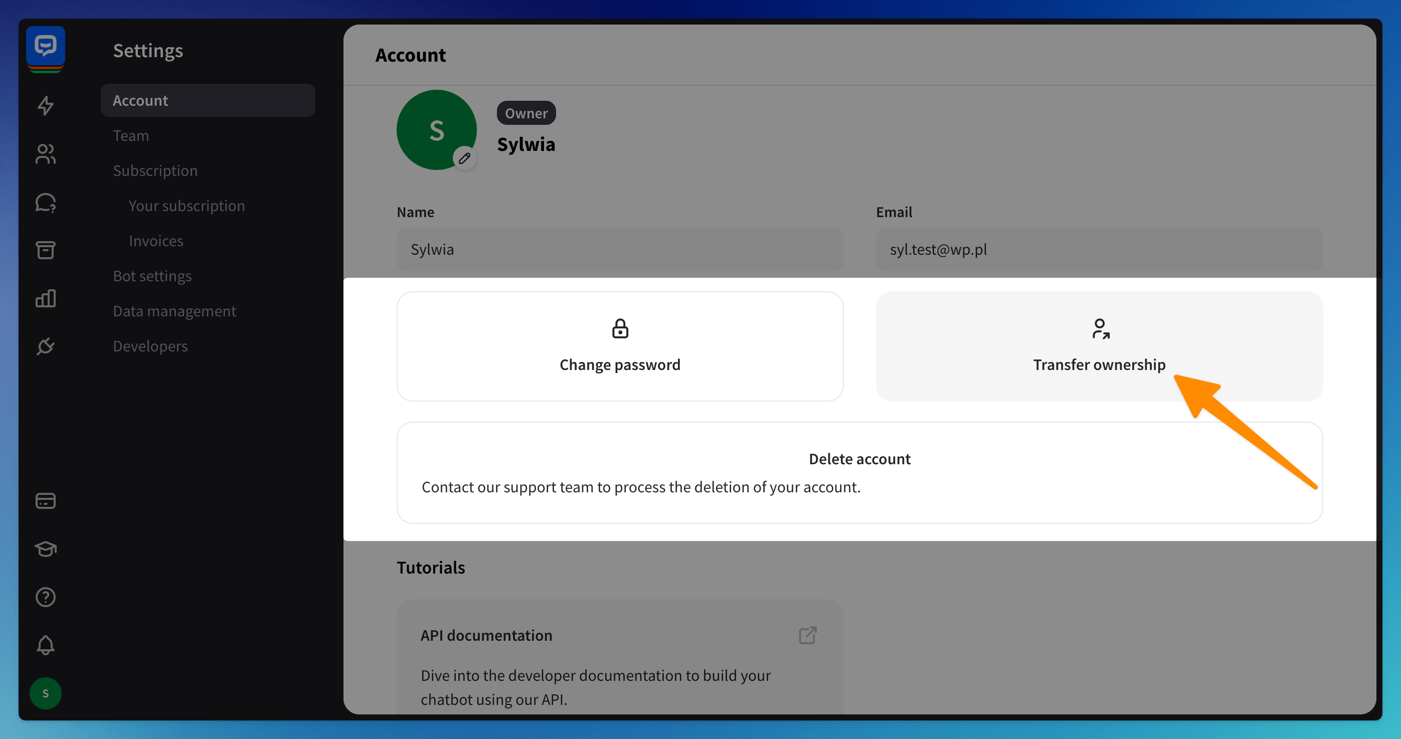 If you cannot access the owner account to change the email address, contact us at support@chatbot.com