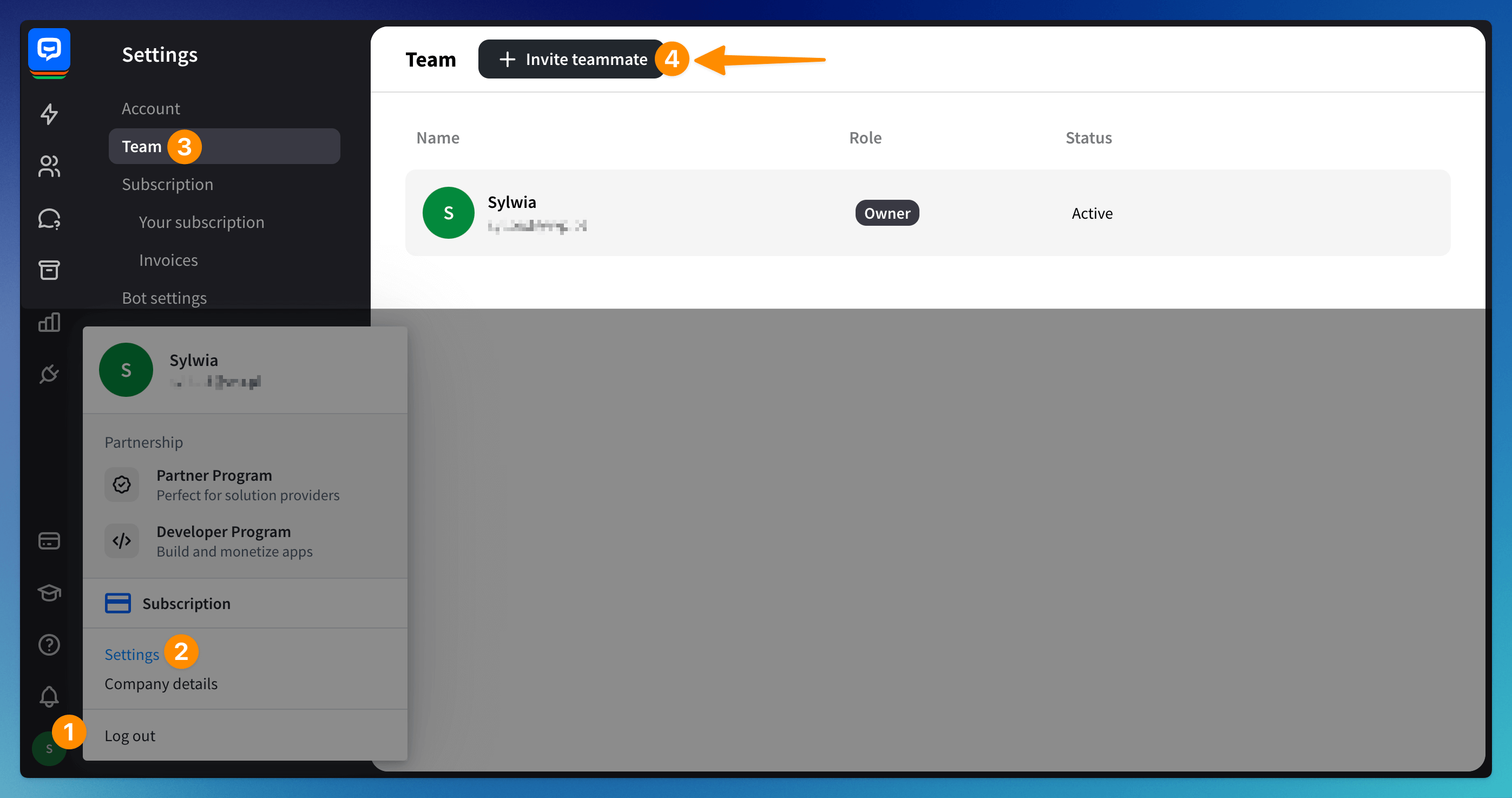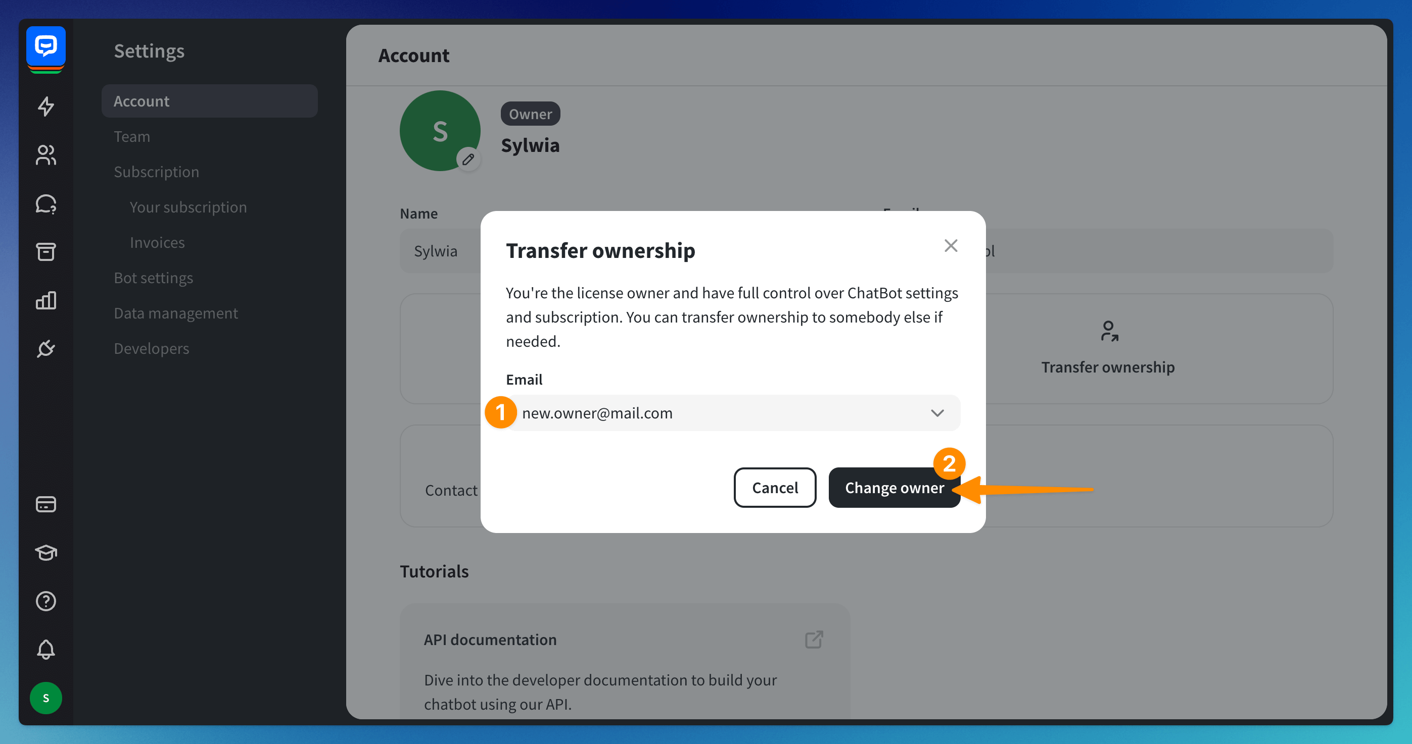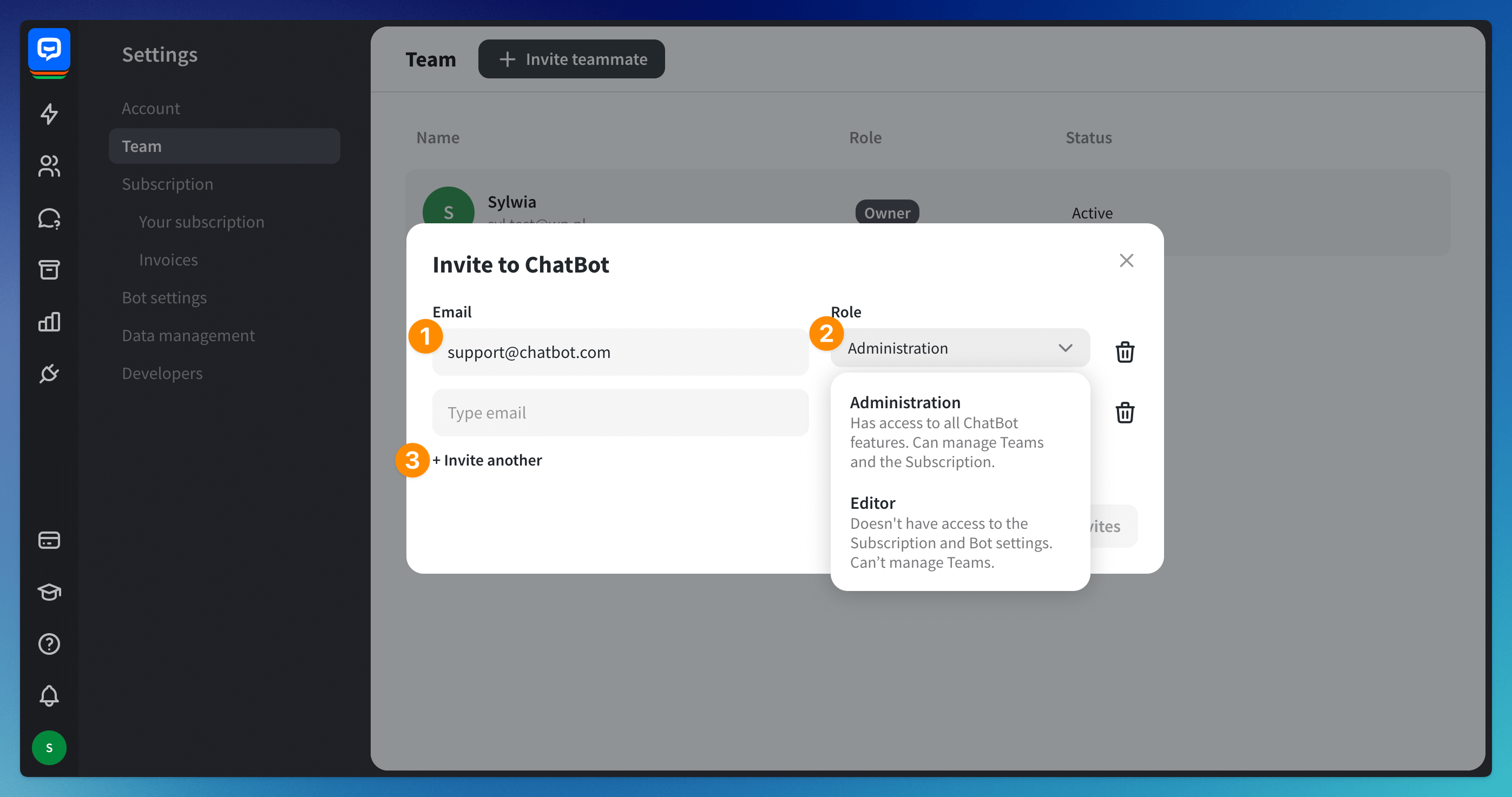 The owner is the person who created the ChatBot account. They have full access to the dashboard and the subscription section. They add new ChatBot teammates and remove them when needed. Each account can only have one person assigned as the owner.