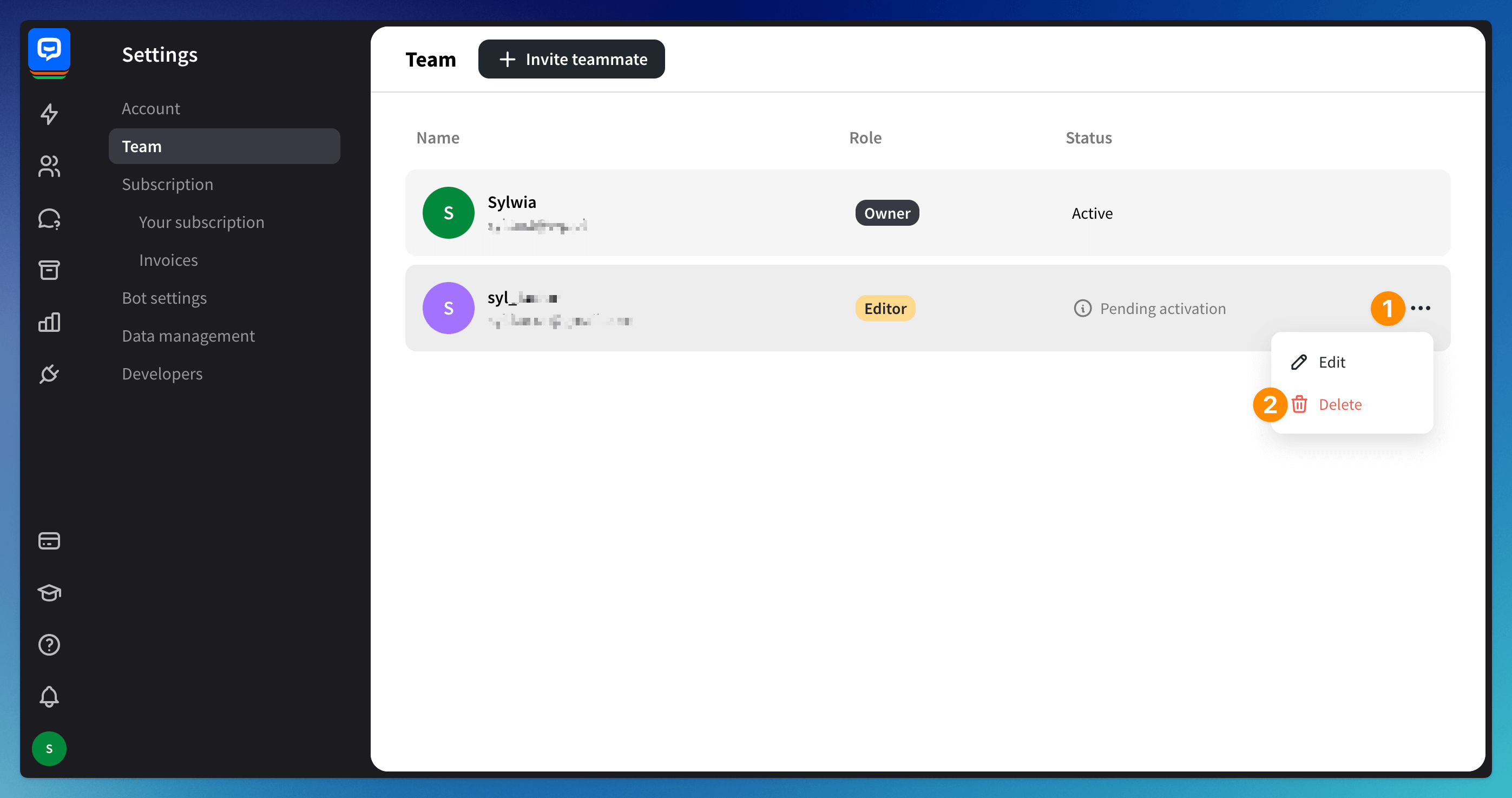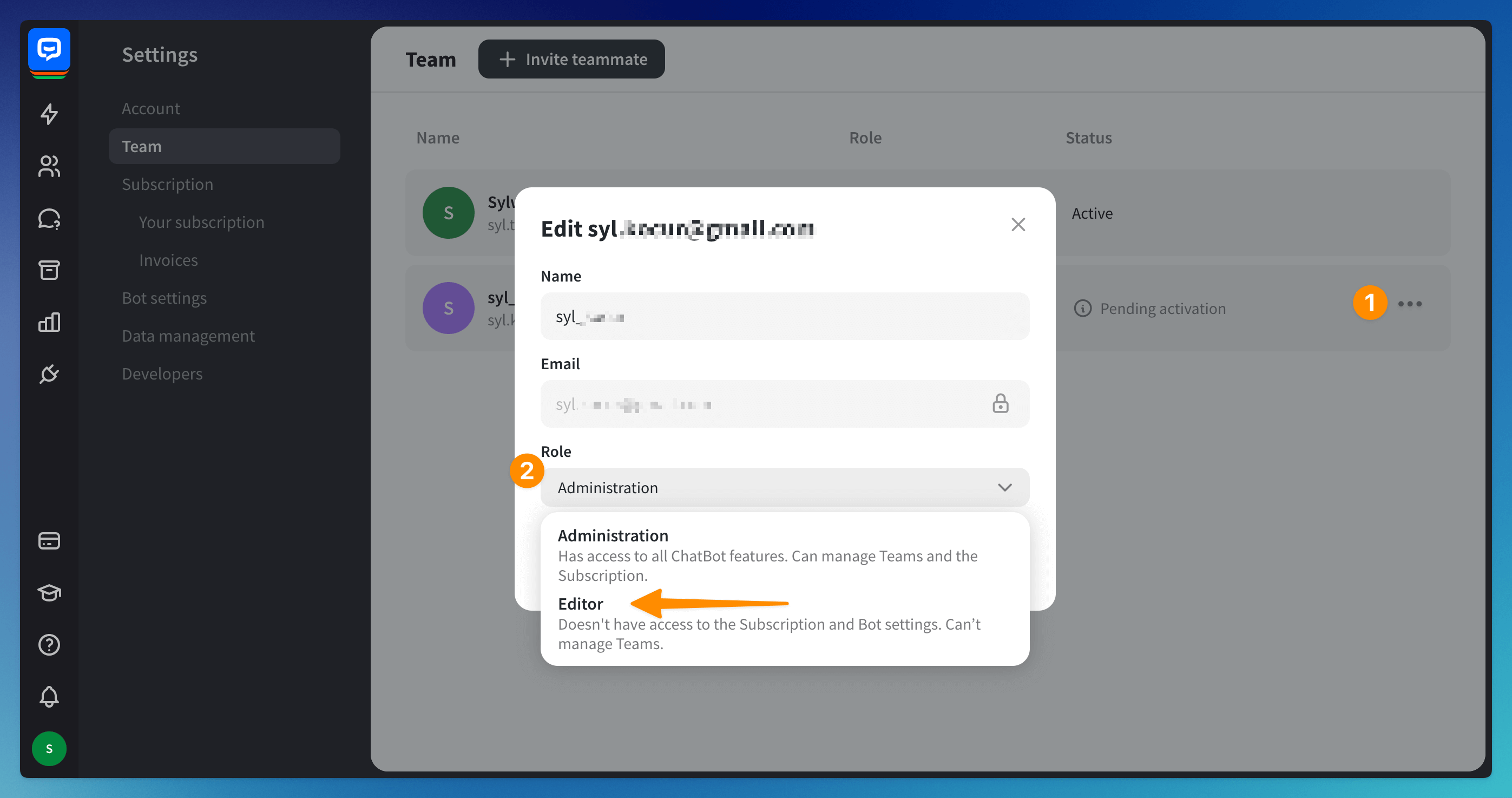 Editors can manage your dashboard but can’t access advanced account settings like the subscription. They also can’t add and remove teammates. You can invite as many editors to share your ChatBot account as you need.